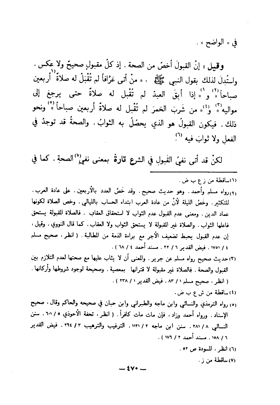 وَقِيلَ: إنَّ الْقَبُولَ أَخَصُّ مِنْ الصِّحَّةِ، إذْ كُلُّ مَقْبُولٍ صَحِيحٌ وَلا عَكْسَ. وَاسْتَدَلَّ لِذَلِكَ بِقَوْلِ النَّبِيِّ صَلَّى اللَّهُ عَلَيْهِ وَسَلَّمَ: "مَنْ أَتَى عَرَّافًا لَمْ تُقْبَلْ لَهُ صَلاةٌ 1 أَرْبَعِينَ صَبَاحًا" 2 وَ 1 "إذَا أَبَقَ الْعَبْدُ لَمْ تُقْبَلْ لَهُ صَلاةٌ حَتَّى يَرْجِعَ إلَى مَوَالِيهِ" 3 وَ4 "مَنْ شَرِبَ الْخَمْرَ لَمْ تُقْبَلْ لَهُ صَلاةٌ أَرْبَعِينَ صَبَاحًا" 5 وَنَحْوُ ذَلِكَ. فَيَكُونُ الْقَبُولُ هُوَ الَّذِي يَحْصُلُ بِهِ الثَّوَابُ. وَالصِّحَّةُ قَدْ تُوجَدُ فِي الْفِعْلِ وَلا ثَوَابَ فِيهِ6.