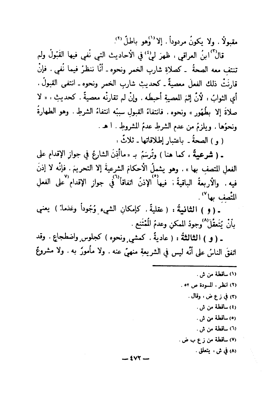 قَالَ3 ابْنُ الْعِرَاقِيِّ: ظَهَرَ لِي4 فِي الأَحَادِيثِ الَّتِي نُفِيَ فِيهَا الْقَبُولَ وَلَمْ تَنْتَفِ مَعَهُ الصِّحَّةُ - كَصَلاةِ شَارِبِ الْخَمْرِ وَنَحْوِهِ- أَنَّا نَنْظُرُ فِيمَا نُفِيَ، فَإِنْ قَارَنَتْ ذَلِكَ الْفِعْلَ مَعْصِيَةٌ، - كَحَدِيثِ شَارِبِ الْخَمْرِ وَنَحْوِهِ-؛ انْتَفَى، الْقَبُولُ. أَيْ الثَّوَابُ، لأَنَّ إثْمَ الْمَعْصِيَةِ أَحْبَطَهُ، وَإِنْ لَمْ تُقَارِنْهُ مَعْصِيَةٌ. كَحَدِيثِ: "لا صَلاةَ إلاَّ بِطُهُورٍ" وَنَحْوِهِ، فَانْتِفَاءُ الْقَبُولِ سَبَبُهُ انْتِفَاءُ الشَّرْطِ، وَهُوَ الطَّهَارَةُ وَنَحْوُهَا، وَيَلْزَمُ مِنْ عَدَمِ الشَّرْطِ عَدَمُ الْمَشْرُوطِ. انْتَهَى.