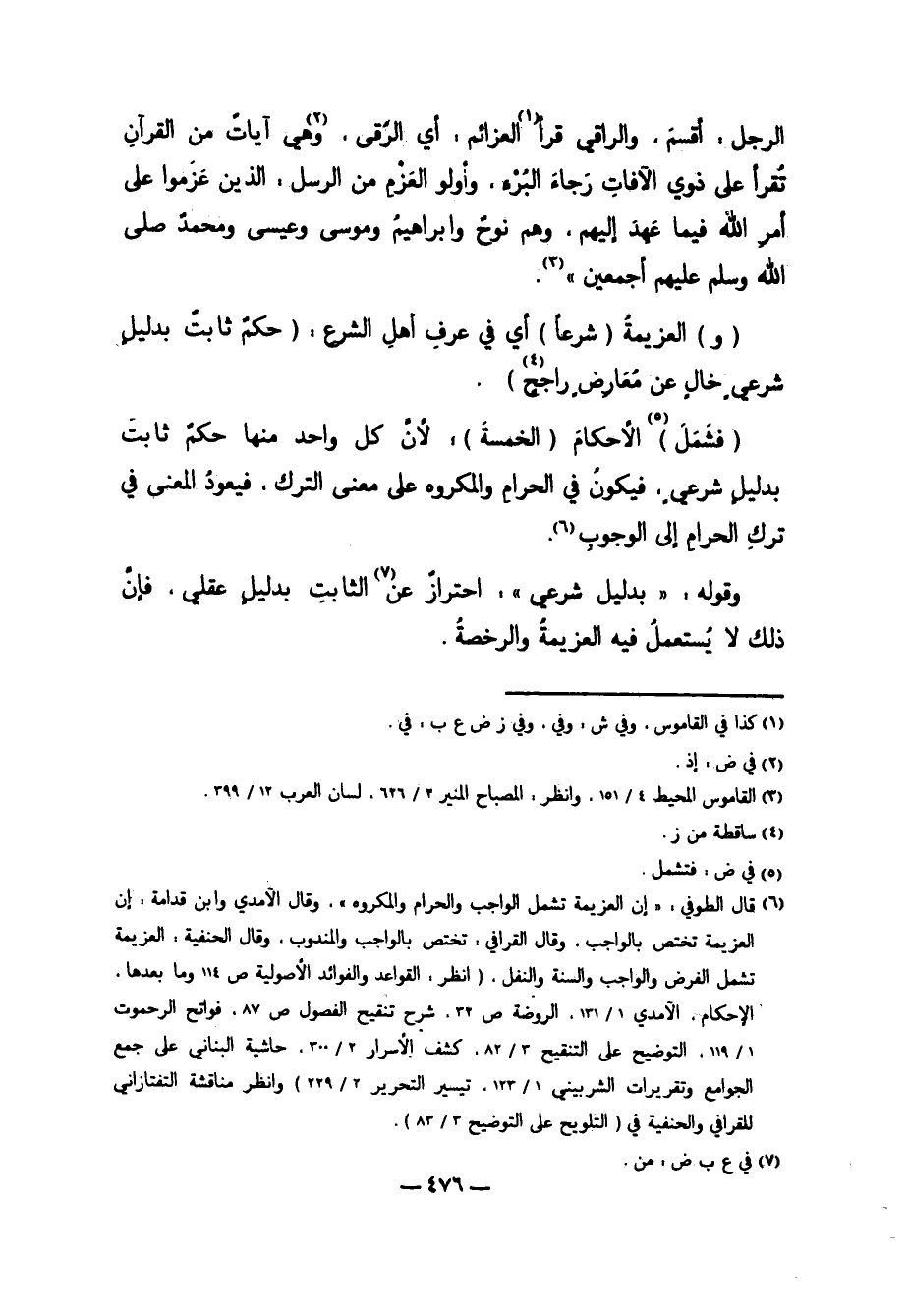 6 قال الطوفي: "إن العزيمة تشمل الواجب والحرام والمكروه". وقال الآمدي وابن قدامة: إن العزيمة تختص بالواجب، وقال القرافي: تخص بالواجب والمندوب، وقال الحنفية: العزيمة تشمل الفرض والواجب والسنة والنقل، "انظر: القواعد والفوائد الأصولية ص114 وما بعدها، الإحكام، الآمدي 1/ 131، الروضة ص32، شرح تنقيح الفصول ص87، فواتح الرحموت 1/ 119، التوضيح على التنقيح 3/ 82، كشف الأسرار 2/ 300، حاشية البناني على جمع الجوامع وتقريرات الشربيني 1/ 123، تيسير التحرير 2/ 229" وانظر مناقشة التفتازاني للقرافي والحنفية في "التلويح على التوضيح 3/ 83".