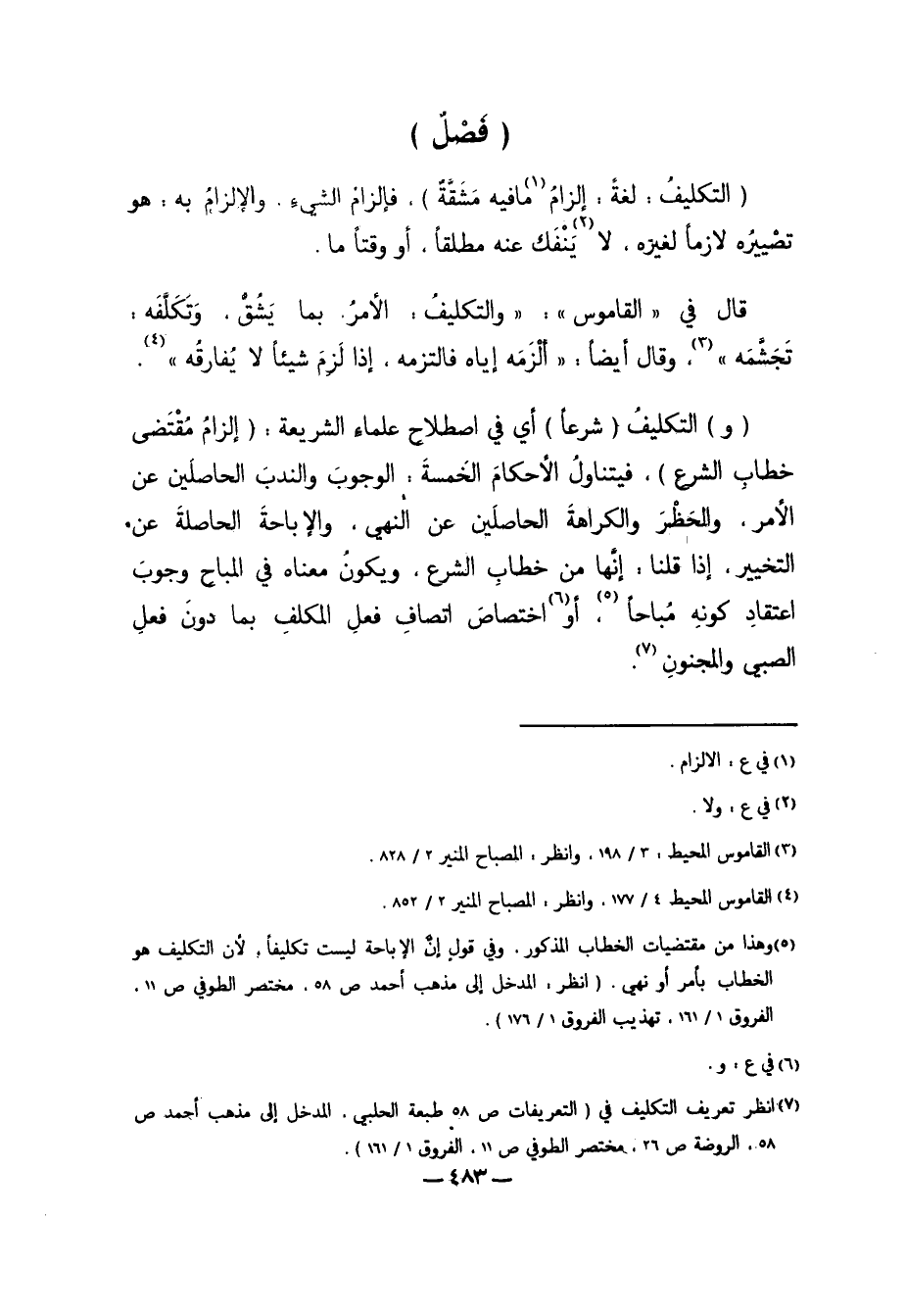 7 انظر تعريف التكليف في "التعريفات ص58، طبعة الحلبي، المدخل إلى مذهب أحمد ص58، الروضة ص26،مختصر الطوفي ص11،الفروق 1/ 161".