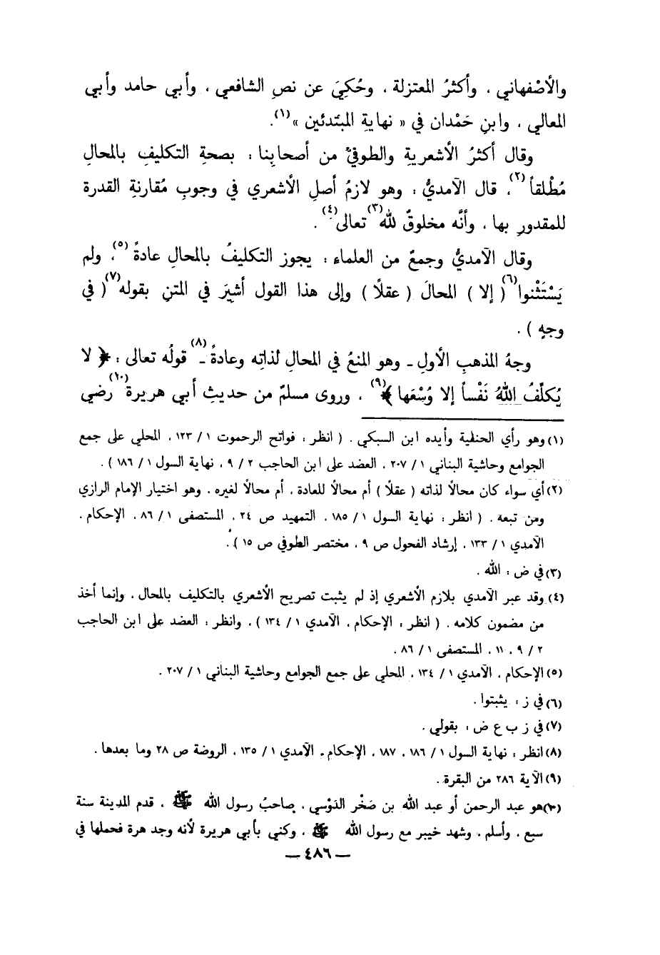 4 وقد عبر الآمدي بلازم الأشعري إذ لم يثبت تصريح الأشعري بالتكليف بالمحال، وإنما أخذ من مضمون كلامه. "انظر: الإحكام، الآمدي 1/ 134"، وانظر: العضد على ابن الحاجب 2/ 9، 11، المستصفى 1/ 86.