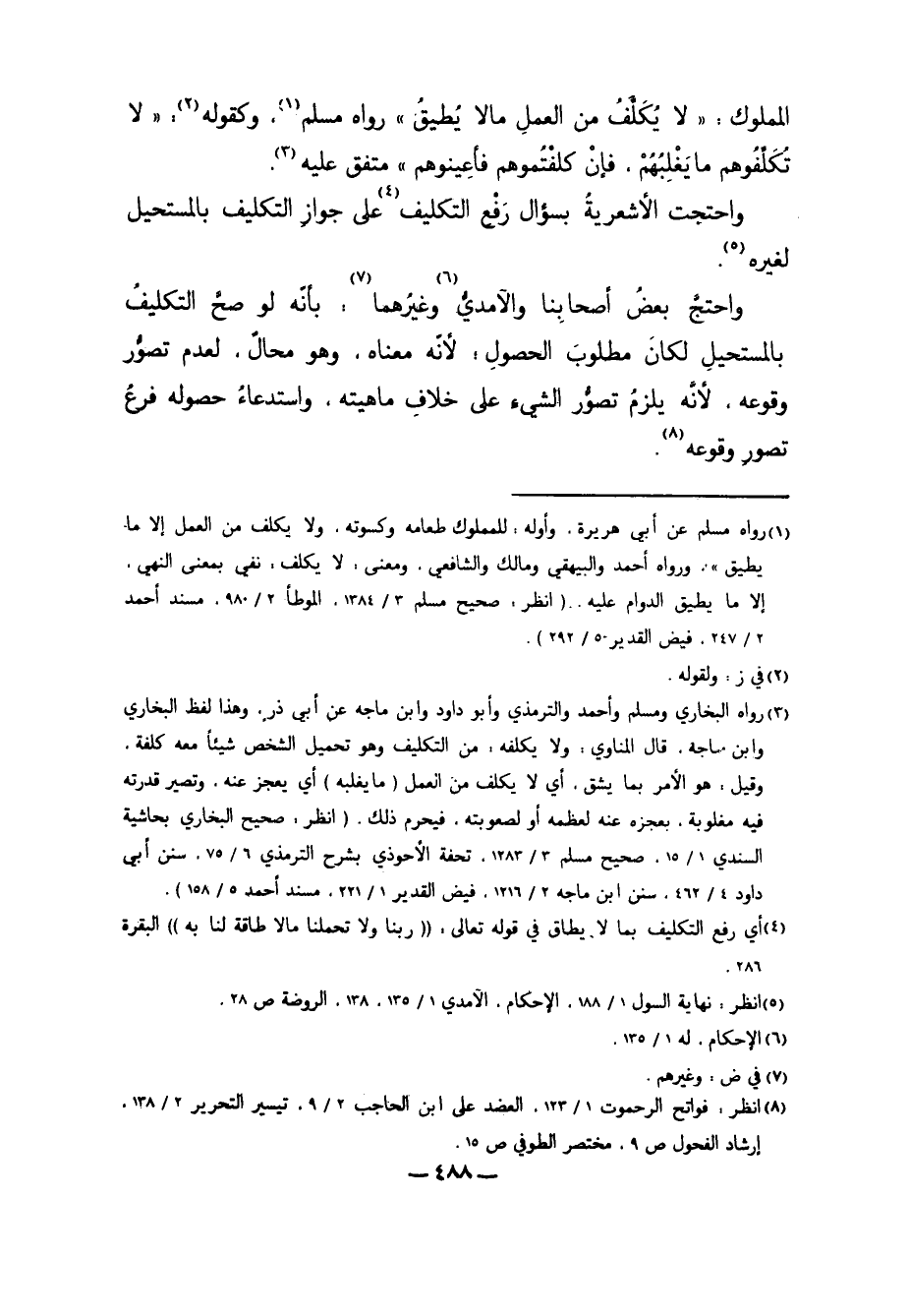 الْمَمْلُوكِ: "لا يُكَلَّفُ مِنْ الْعَمَلِ مَا لا يُطِيقُ" رَوَاهُ مُسْلِمٌ1، وَكَقَوْلِهِ2: "لا تُكَلِّفُوهُمْ مَا يَغْلِبُهُمْ. فَإِنْ كَلَّفْتُمُوهُمْ فَأَعِينُوهُمْ" مُتَّفَقٌ عَلَيْهِ3.