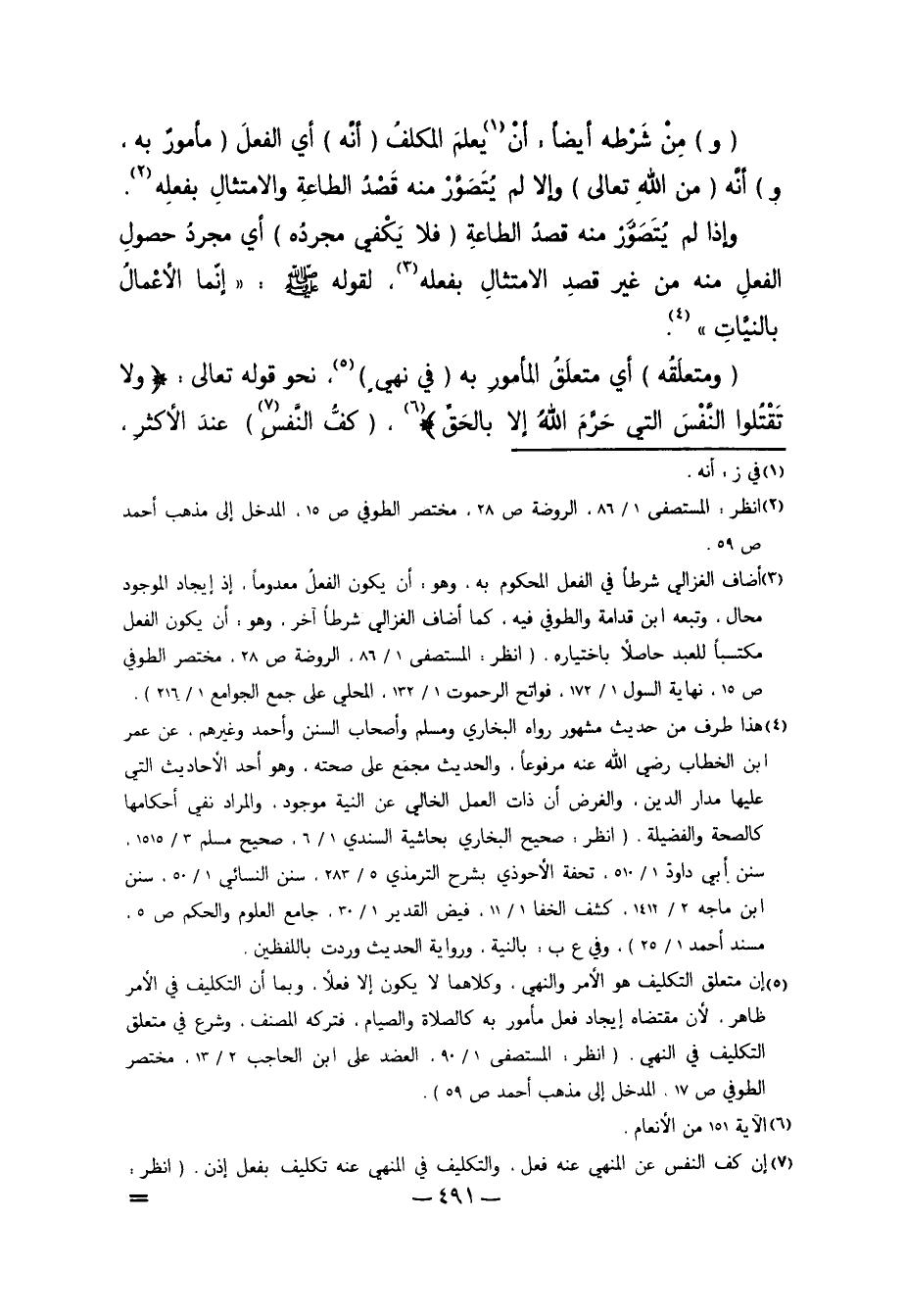 3 أضاف الغزالي شرطاً في الفعل المحكوم به، وهو: أن يكون الفعلُ معدوماً، إذ إيجاد الموجود محال، وتبعه ابن قدامة والطوفي فيه، كما أضاف الغزالي شرطاً آخر، وهو: أن يكون الفعل مكتسباً للعبد حاصلاً باختياره. "انظر: المستصفى 1/ 86، الروضة ص28، مختصر الطوفي ص15، نهاية السول 1/ 172، فواتح الرحموت 1/ 132، المحلي على جمع الجوامع 1/ 216".