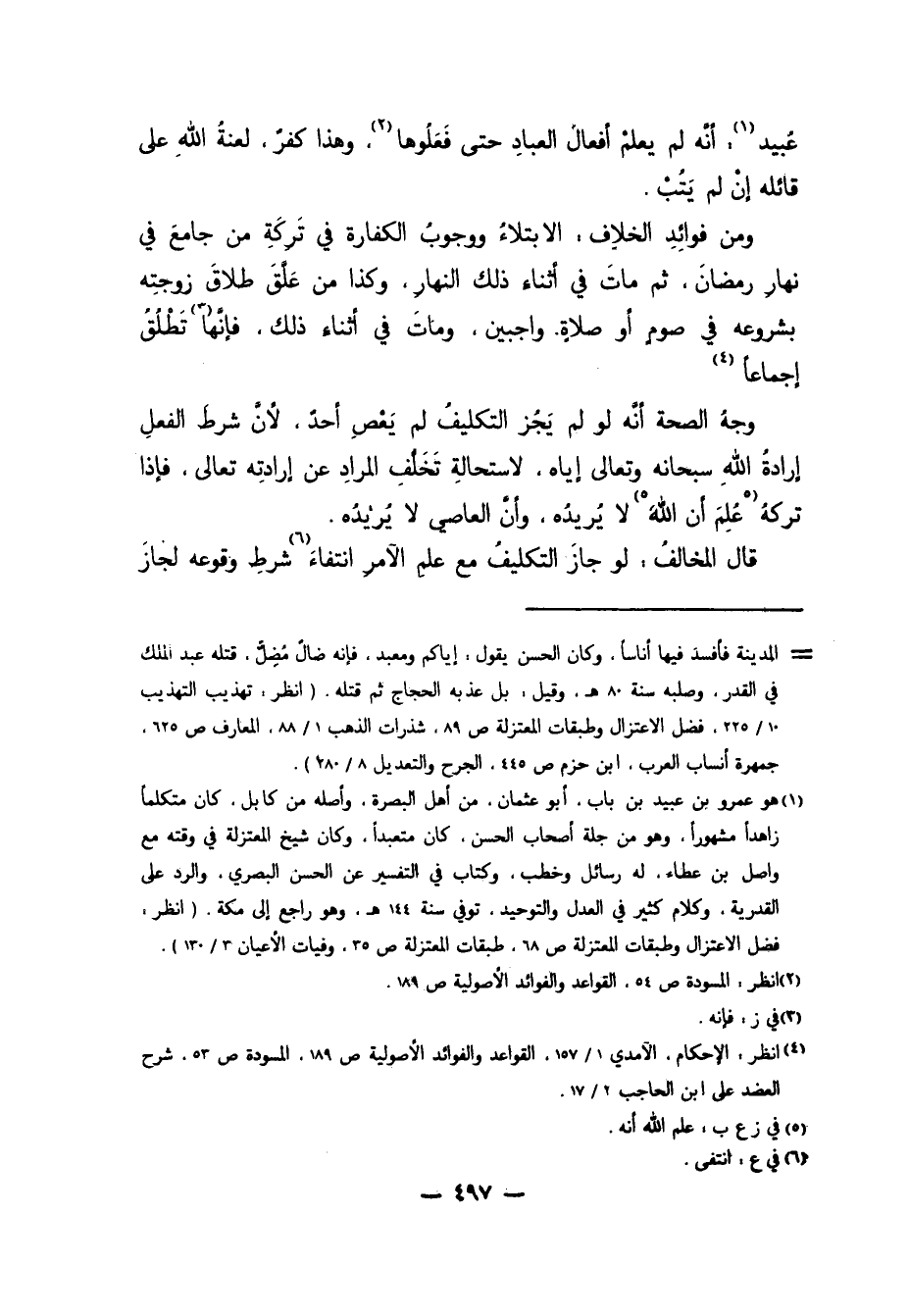 1 هو عمر بن عبيد بن باب، أبو عثمان، من أهل البصرة، وأصله من كابل، كان متكلماً زاهداً مشهوراً، وهو من جلة أصحاب الحسن، كان متعبداً، وكان شيخ المعتزلة في وقته مع واصل بن عطاء، له رسائل وخطب، وكتاب في التفسير عن الحسن البصري، والرد على القدرية، وكلام كثير في العدل والتوحيد، توفي سنة 144هـ، وهو راجع إلى مكة. "انظر: فضل الاعتزال وطبقات المعتزلة ص68، طبقات المعتزلة ص35، وفيات الأعيان 3/ 130".