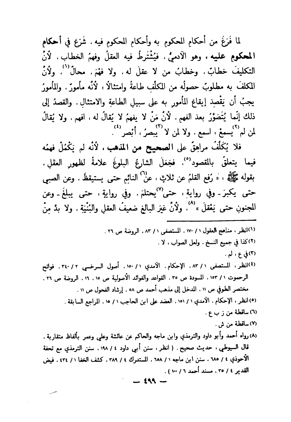 4 انظر: المستصفى 1/ 83، الإحكام، الآمدي 1/ 150، أصول السرخسي 2/ 340، فواتح الرحموت 1/ 153، المسودة ص35، القواعد والفوائد الأصولية ص15، 16، الروضة ص26، مختصر الطوفي ص11، المدخل إلى مذهب أحمد ص58، إرشاد الفحول ص11.