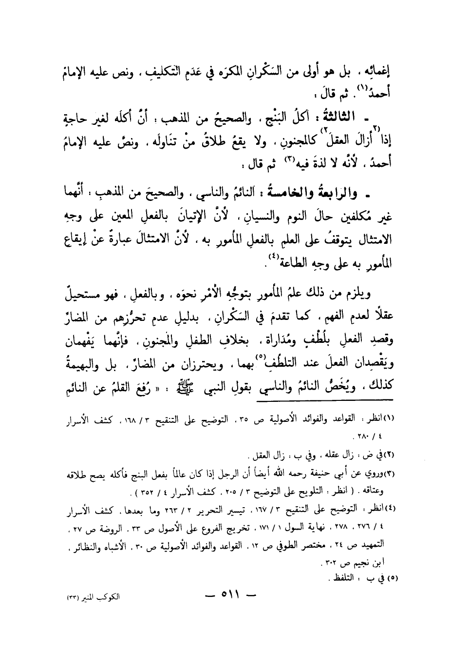 3 وروي عن أبي حنيفة رحمه الله أيضاً أن الرجل إذا كان عالماً بفعل البنج فأكله يصح طلاقه وعتاقه. "انظر: التلويح على التوضيح 3/ 205، كشف الأسرار 4/ 352".