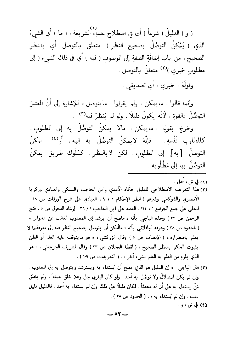 "وَ" الدَّلِيلُ "شَرْعًا" أَيْ فِي اصْطِلاحِ عُلَمَاءِ1 الشَّرِيعَةِ: "مَا" أَيْ الشَّيْءُ الَّذِي "يُمْكِنُ التَّوَصُّلُ بِصَحِيحِ النَّظَرِ" - مُتَعَلِّقٌ بِالتَّوَصُّلِ- أَيْ بِالنَّظَرِ الصَّحِيحِ؛ مِنْ بَابِ إضَافَةِ الصِّفَةِ إلَى الْمَوْصُوفِ "فِيهِ" أَيْ فِي ذَلِكَ الشَّيْءِ "إلَى مَطْلُوبٍ خَبَرِيٍّ"2 مُتَعَلِّقٌ بِالتَّوَصُّلِ.