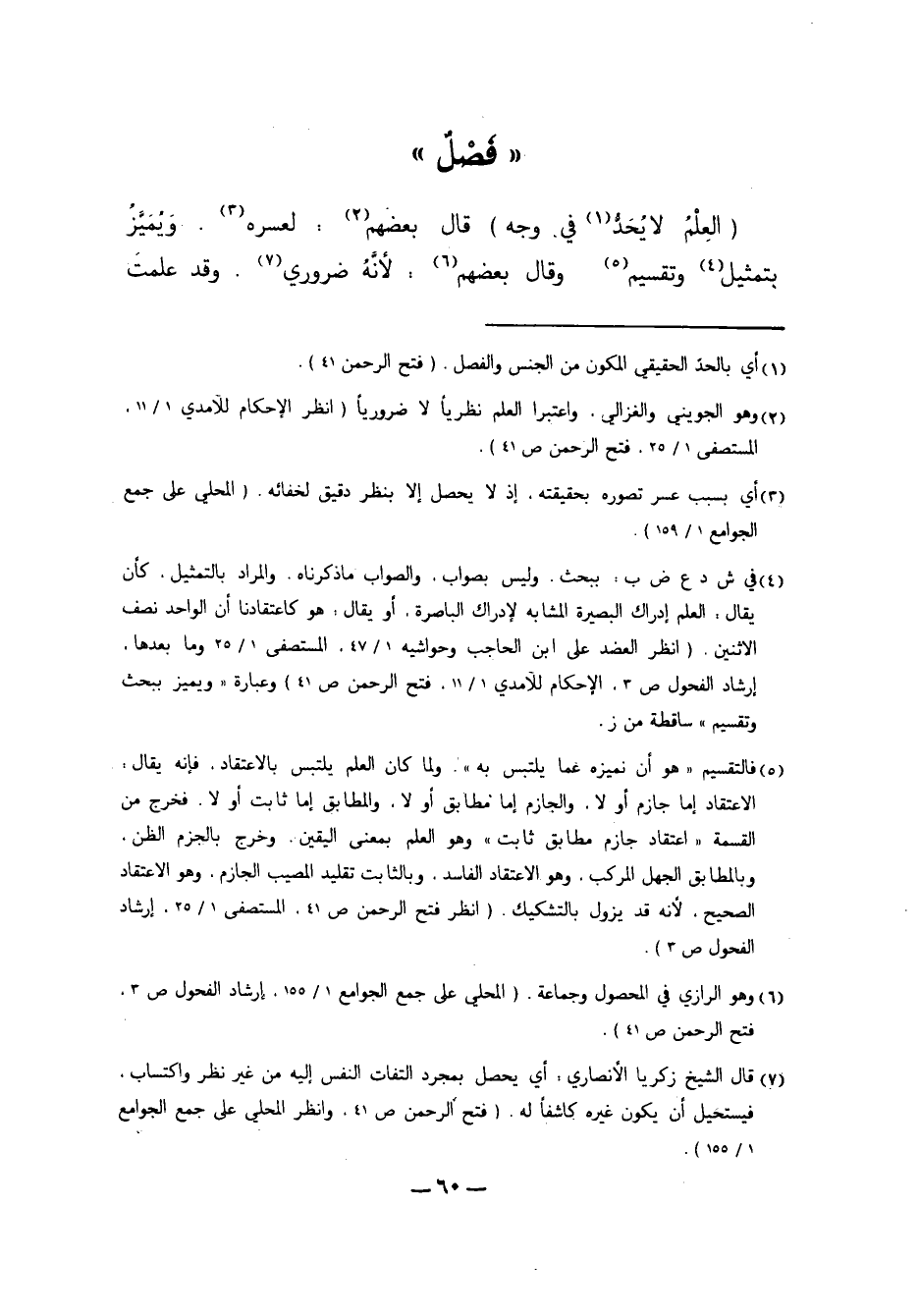 "الْعِلْمُ لا يُحَدُّ1 فِي وَجْهٍ" قَالَ بَعْضُهُمْ2: لِعُسْرِهِ3 وَيُمَيَّزُ بِتَمْثِيلٍ4 وَتَقْسِيمٍ5 وَقَالَ بَعْضُهُمْ6: لأَنَّهُ ضَرُورِيٌّ7. وَقَدْ عَلِمْت
