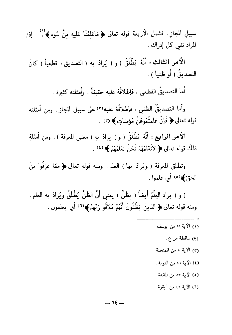 "وَ" يُرَادُ الْعِلْمُ أَيْضًا "بِظَنٍّ" يَعْنِي أَنَّ الظَّنَّ يُطْلَقُ وَيُرَادُ بِهِ الْعِلْمُ. وَمِنْهُ قَوْله تَعَالَى: {الَّذِينَ يَظُنُّونَ أَنَّهُمْ مُلاقُو رَبِّهِمْ} 6، أَيْ يَعْلَمُونَ.
