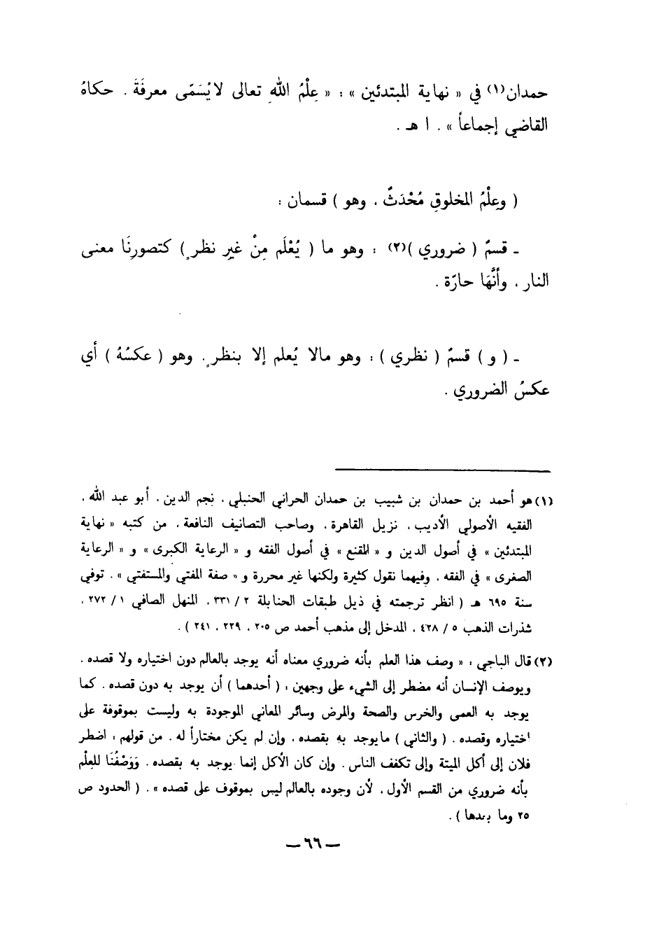 "وَعِلْمُ الْمَخْلُوقِ مُحْدَثٌ، وَهُوَ" قِسْمَانِ: