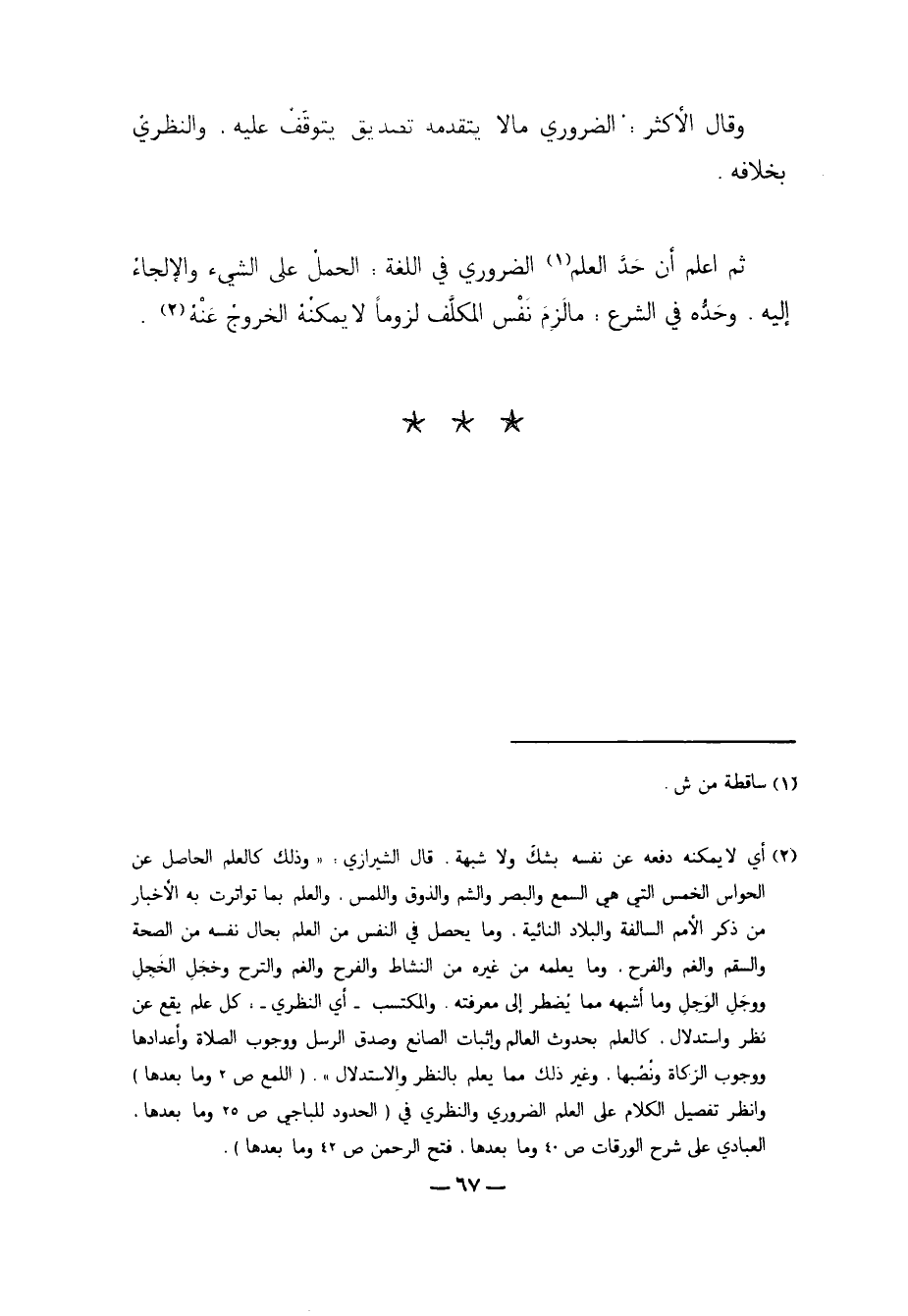 2 أي لا يمكنه دفعه عن نفسه بشكّ ولا شيهة. قال الشيرازي: "وذلك كالعلم الحاصل عن الحواس الخمس التي هي السمع والبصر والشم والذوق واللمس، والعلم بما تواترت به الأخبار من ذكر الأمم السالفة والبلاد النائية، وما يحصل في النفس من العلم بحال نفسه من الصحة والسقم والغم والفرج، وما يعلمه من غيره من النشاط والفرح والغم والترح وخجَلِ الخَجِلِ ووجَلِ الوَجِلِ وما أشبهه مما يُضطر إلى معرفته. والمكتسب –إي النظري-: كل علم يقع عن نظر واستدلال، كالعلم بحدوث العالم وإثبات الصانع وصدق الرسل ووجوب الصلاة وأعدادها ووجوب الزكاة ونُصُبها، وغير ذلك مما يعلم بالنظر والاستدلال". "اللمع ص2 وما بعدها" وانظر تفصيل الكلام على العلم الضروري والنظري في "الحدود للباجي ص25 وما بعدها، العبادي على شرح الورقات ص40 وما بعدها، فتح الرحمن ص42 وما بعدها".