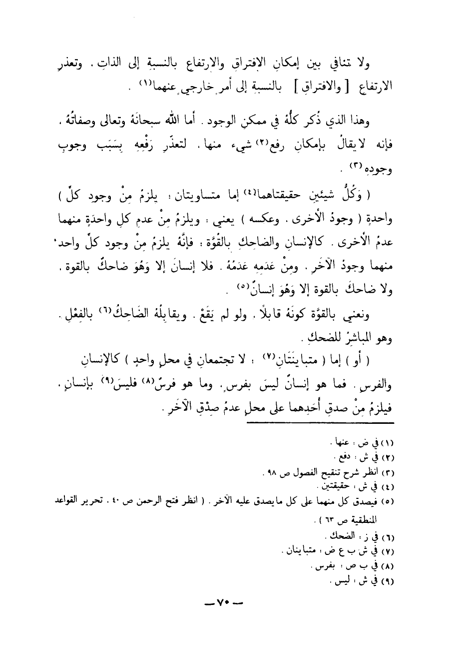 وَهَذَا الَّذِي ذُكِرَ كُلُّهُ فِي مُمْكِنِ الْوُجُودِ. أَمَّا اللَّهُ سُبْحَانَهُ وَتَعَالَى وَصِفَاتُهُ: فَإِنَّهُ لا يُقَالُ بِإِمْكَانِ رَفْعِ2 شَيْءٍ مِنْهَا، لِتَعَذُّرِ رَفْعِهِ بِسَبَبِ وُجُوبِ وُجُودِهِ3.