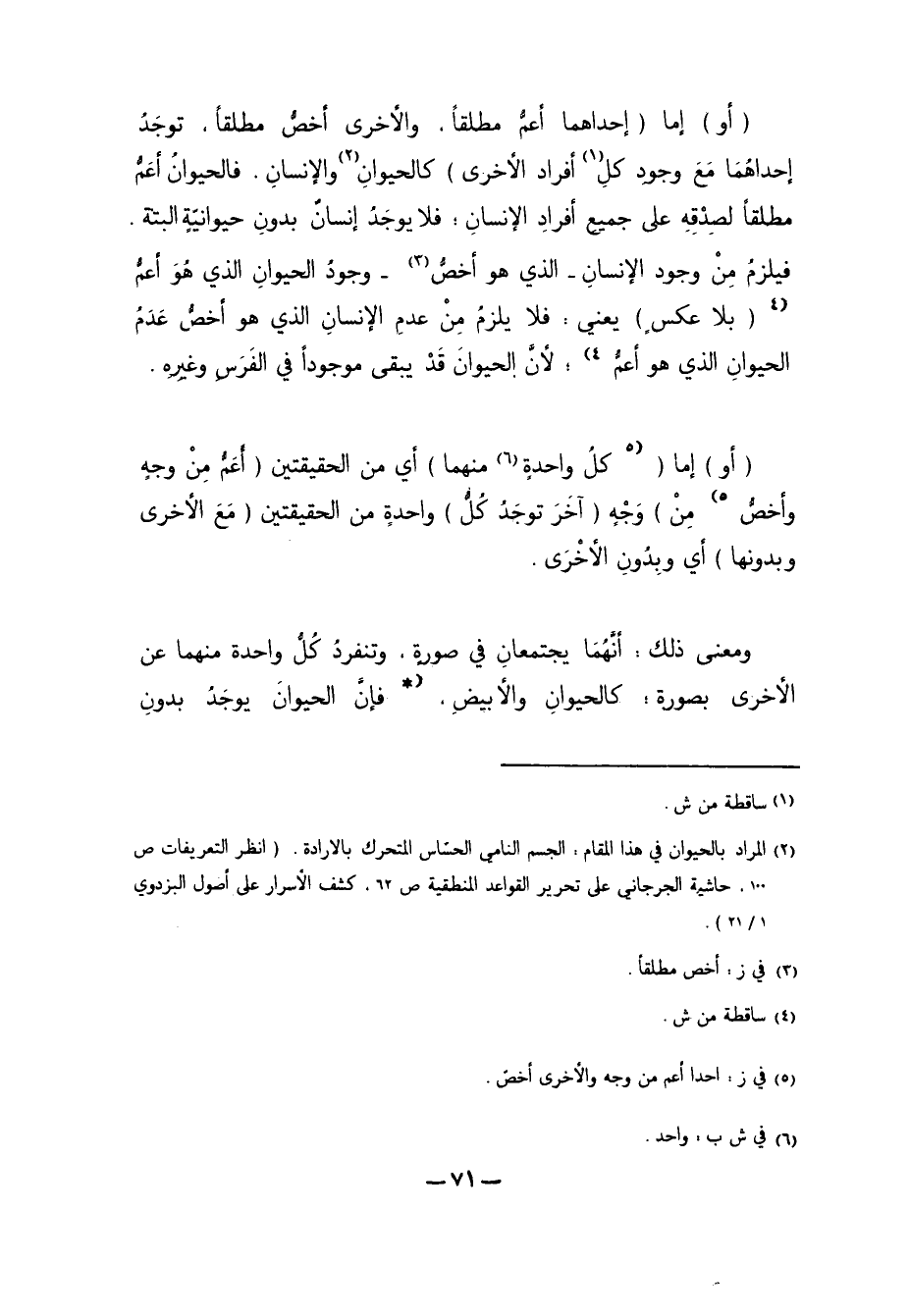 2 المراد بالحيوان في هذا المقام: الجسم النامي الحسّاس المتحرك بالارادة. "انظر التعريفات ص100، حاشية الجرجاني على تحرير القواعد المنطقية ص62، كشف الأسرار على أصول البزدوي 1/ 21".