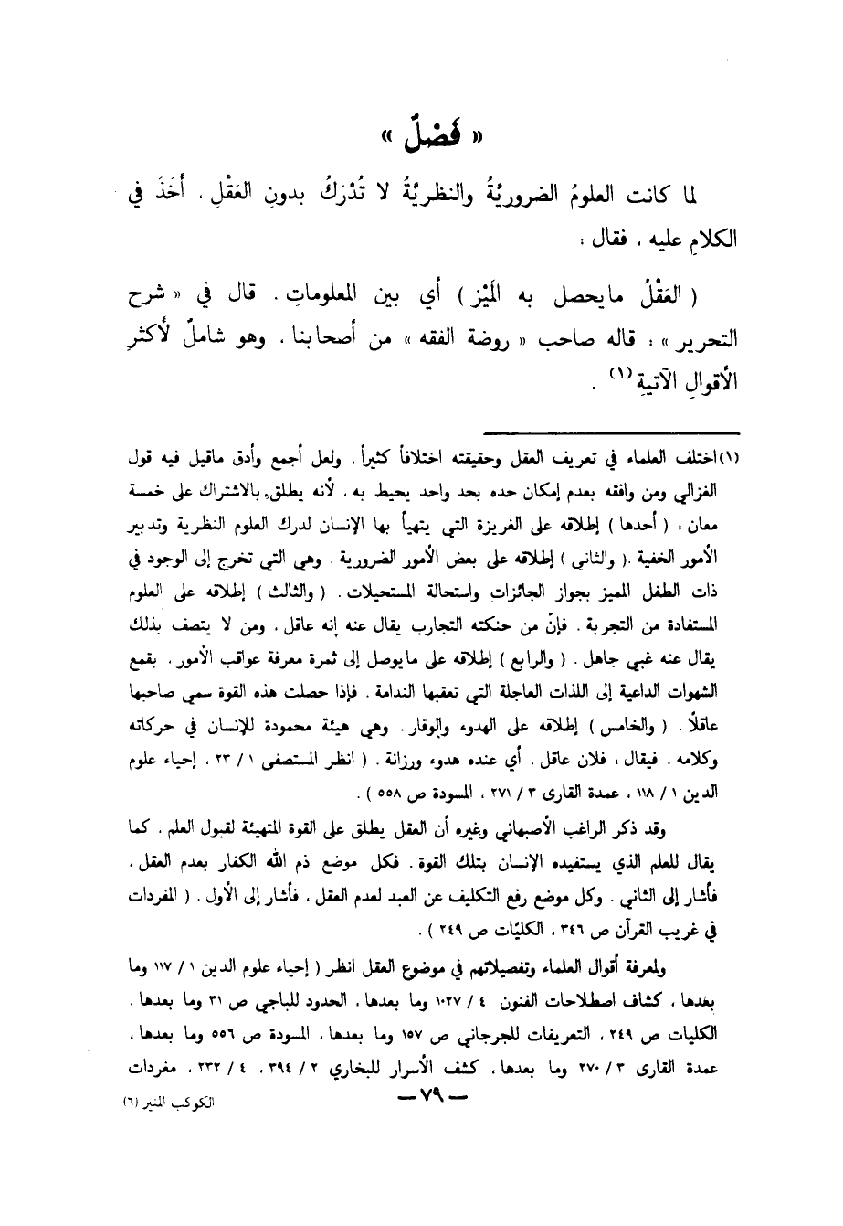 ولمعرفة أقوال العلماء وتفصيلاتهم في موضوع العقل انظر "إحياء علوم الدين 1/ 117 وما بعدها، كشاف اصطلاحات الفنون 4/ 1027 وما بعدها، الحدود للباجي ص31 وما بعدها، الكليات ص249، التعريفات للجرجاني ص157 وما بعدها، المسودة ص556 وما بعدها، عمدة القارى 3/ 270 وما بعدها، كشف الأسرار للبخاري 2/ 394، 4/ 232، مفردات الراغب ص346، فتح الرحمن وحاشية العليمي عليه ص20، 23، ذم الهوى لابن الجوزي ص5، مائية العقل للمحاسبي ص201 وما بعدها، أدب الدنيا والدين للماوردي ص2 وما بعدها، أعلام النبوة للماوردي ص7".
