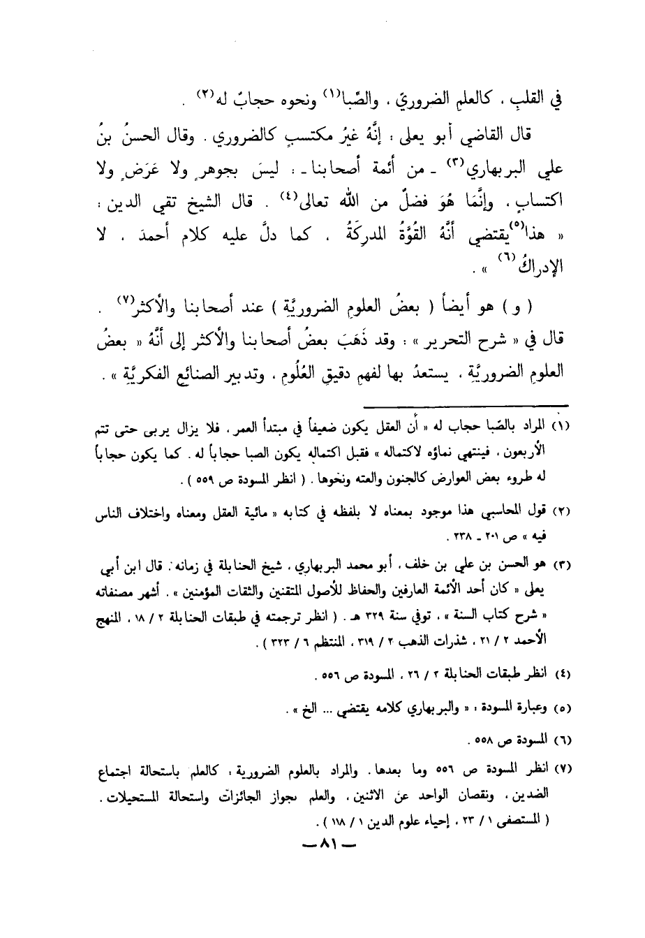 7 انظر المسودة ص556 وما بعدها. والمراد بالعلوم الضرورية: كالعلم باستحالة اجتماع الضدين، ونقصان الواحد عن الاثنين، والعلم بجواز الجائزات واستحالة المستحيلات. "المستصفى 1/ 23، إحياء علوم الدين 1/ 118".