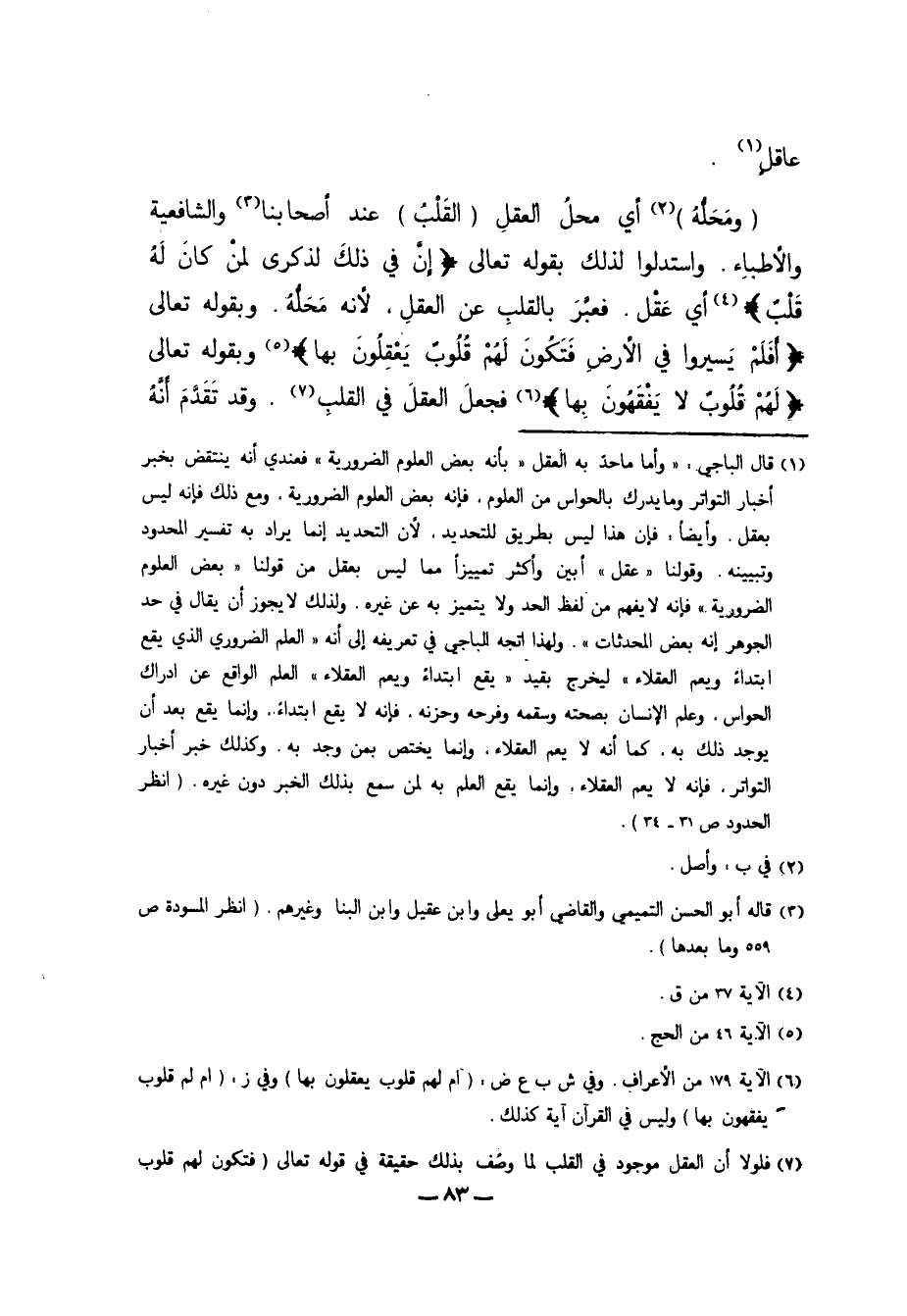 7 فلولا أن العقل موجود في القلب لم وصُف بذلك حقيقة في قوله تعالى: {فَتَكُونَ لَهُمْ قُلُوبٌ يَعْقِلُونَ بِهَا} إذ لا يتصور أن توصف الأذن بأن يُرى بها أو يُشم بها؛ لأن الأصل إضافة منفعة كل عضو إليه، إلا ترى تتمة الآية {.. قُلُوبٌ يَعْقِلُونَ بِهَا أَوْ آذَانٌ يَسْمَعُونَ بِهَا} ، وكذا في قوله تعالى: {أَلَهُمْ أَرْجُلٌ يَمْشُونَ بِهَا أَمْ لَهُمْ أَيْدٍ يَبْطِشُونَ بِهَا أَمْ لَهُمْ أَعْيُنٌ يُبْصِرُونَ بِهَا أَمْ لَهُمْ آذَانٌ يَسْمَعُونَ بِهَا} ، "195 الأعراف"؛ فقد أضاف الله سبحانه إلى كل عضو المنفعة المخصوصة به، مما يثبت أن العقل منفعة القلب ومختص به. وممن ذهب إلى أن العقل محله القلب الإمام مالك والمتكلمون من أهل السنة. "انظر الحدود للباجي ص35".
