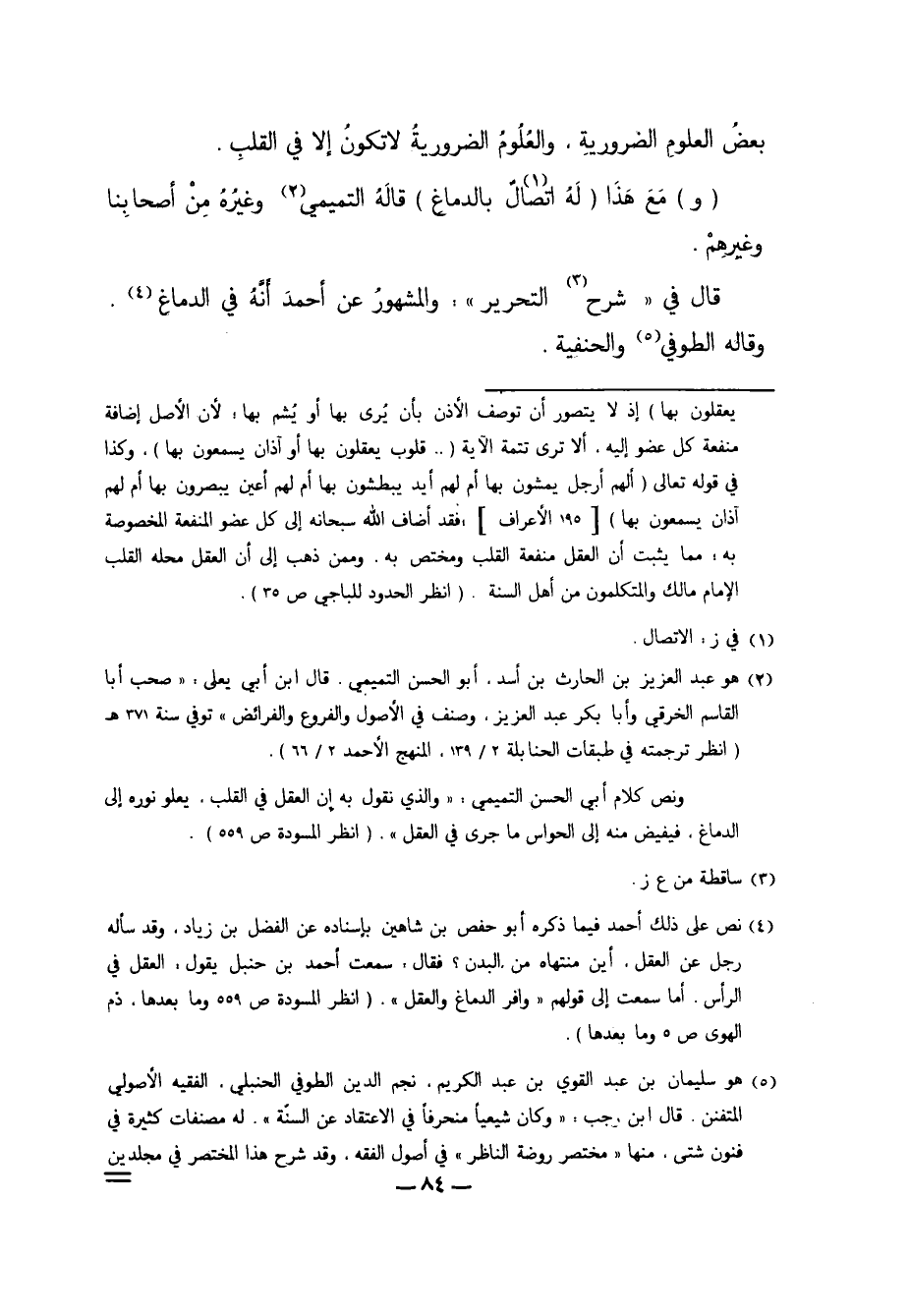 ونص كلام أبي الحسن التميمي: "والذي نقول به إن العقل في القلب، يعلو نوره إلى الدماغ، فيفيض منه إلى الحواس ما جرى في العقل". "انظر المسودة ص559".