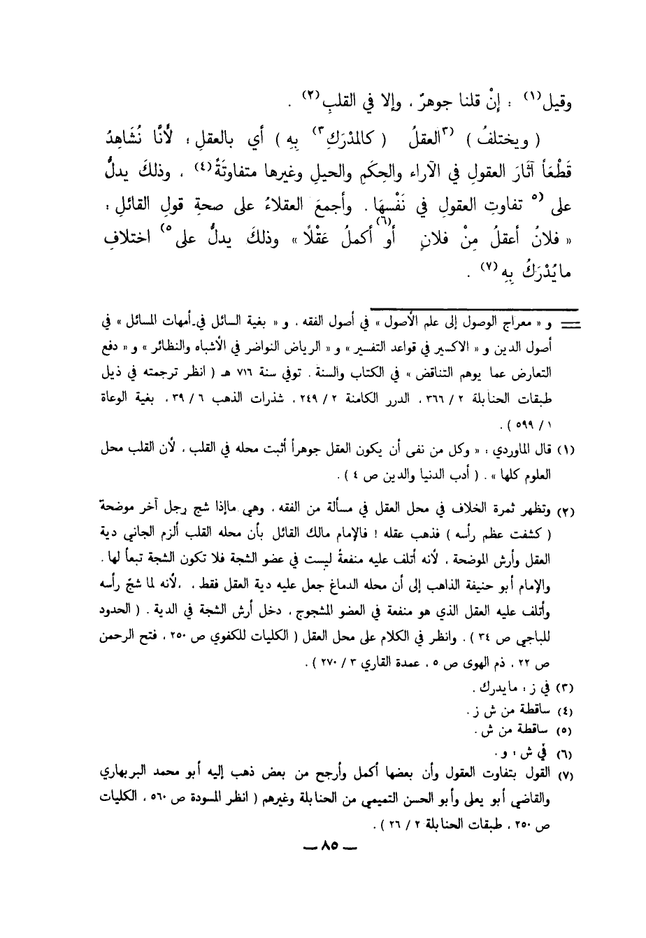 7 القول بتفاوت العقول وأن بعضها أكمل وأرجح من بعض ذهب إليه أبو محمد البربهاري والقاضي أبو يعلى وأبو الحسن التميمي من الحنابلة وغيرهم "انظر المسودة ص560، الكليات ص250، طبقات الحنابلة 2/ 26".