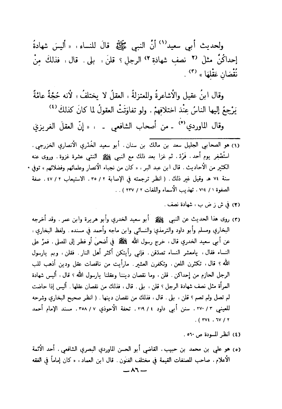 وَلِحَدِيثِ أَبِي سَعِيدٍ1 أَنَّ النَّبِيَّ صَلَّى اللَّهُ عَلَيْهِ وَسَلَّمَ قَالَ لِلنِّسَاءِ: "أَلَيْسَ شَهَادَةُ إحْدَاكُنَّ مِثْلَ 2 نِصْفِ شَهَادَةِ 2 الرَّجُلِ؟ قُلْنَ: بَلَى. قَالَ: فَذَلِكَ مِنْ نُقْصَانِ عَقْلِهَا"3.