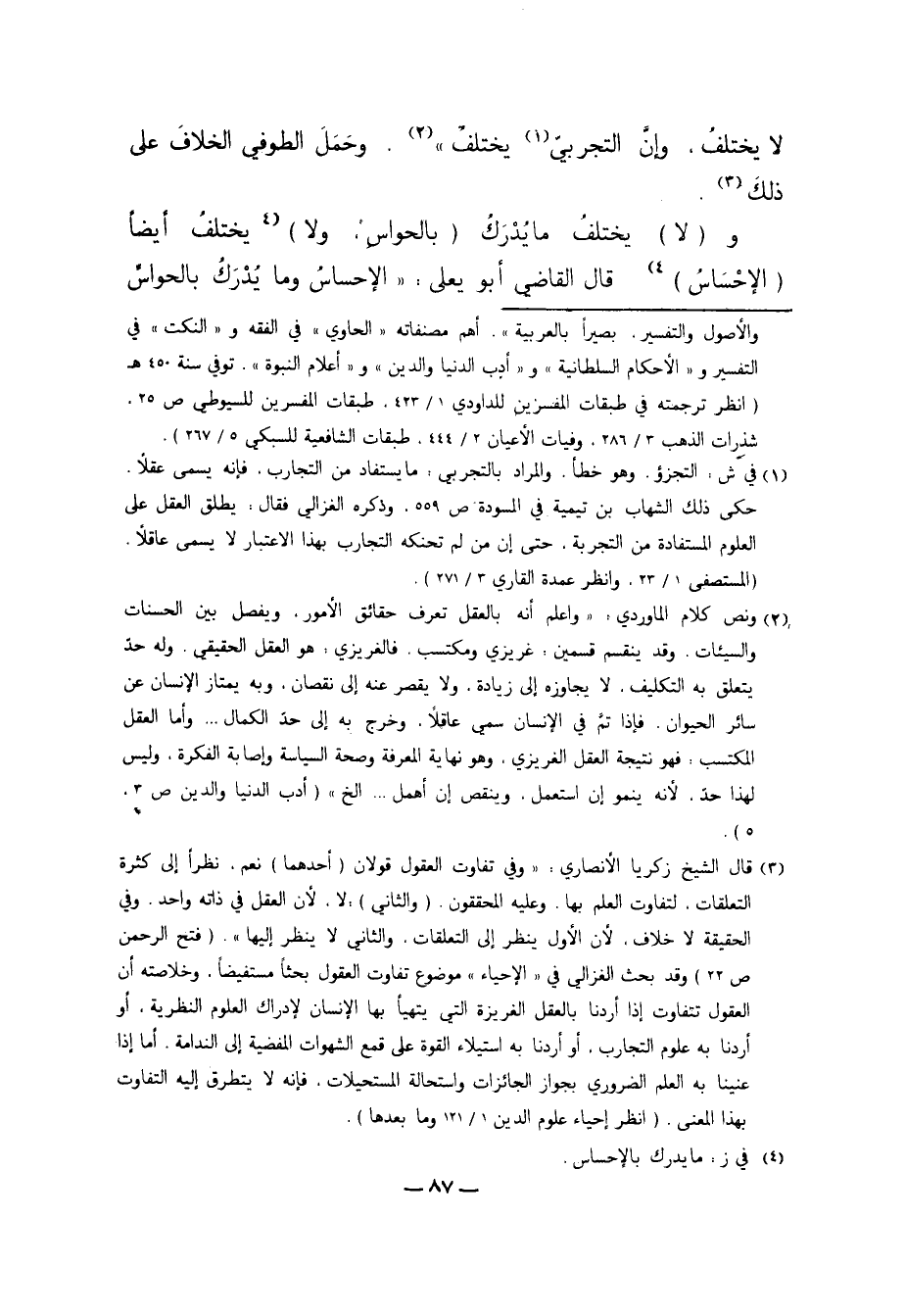 3 قال الشيخ زكريا الأنصاري: "وفي تفاوت العقول قولان "أحدهما" نعم، نظراً إلى كثرة التعليقات، لتفاوت العلم بها. وعليه المحققون. "الثاني": لا، لأن العقل في ذاته واحد. وفي الحقيقة لا خلاف، لأن الأول ينظر إلى التعليقات، والثاني لا ينظر إليها". "فتح الرحمن ص22" وقد بحث الغزالي في "الإحياء" موضوع تفاوت العقول بحثاً مستفيضاً، وخلاصته أن العقول تتفاوت إذا أردنا بالعقل الغريزة التي يتهيأ بها الإنسان لإدراك العلوم النظرية، أو أردنا به علوم التجارب، أو أردنا به استيلاء القوة على قمع الشهوات المفضية إلى الندامة. أما إذا عنينا به العلم الضروري بجواز الجائزات واستحالة المستحيلات، فإنه لا يتطرق إليه التفاوت بهذا المعنى. "انظر إحياة علوم الدين 1/ 121 وما بعدها".