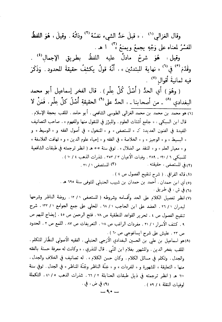 7 انظر تفصيل الكلام على الحد وأقسامه وشروطه "المستضفى 1/ 12، روضة الناظر وشرحها لبدران 1/ 26، العضد على ابن الحاجب 1/ 68، المحلي على جمع الجوامع 1/ 132، شرح تنقيح الفصول ص4، تحرير القواعد المنطقية ص78، فتح الرحمن ص45، إيضاح المبهم ص9، كشف الأسرار 1/ 21، مفردات الراغب ص108، التعريفات ص87، اللمع ص2، الحدود ص23، عليش على شرح ايساغوجي ص60".