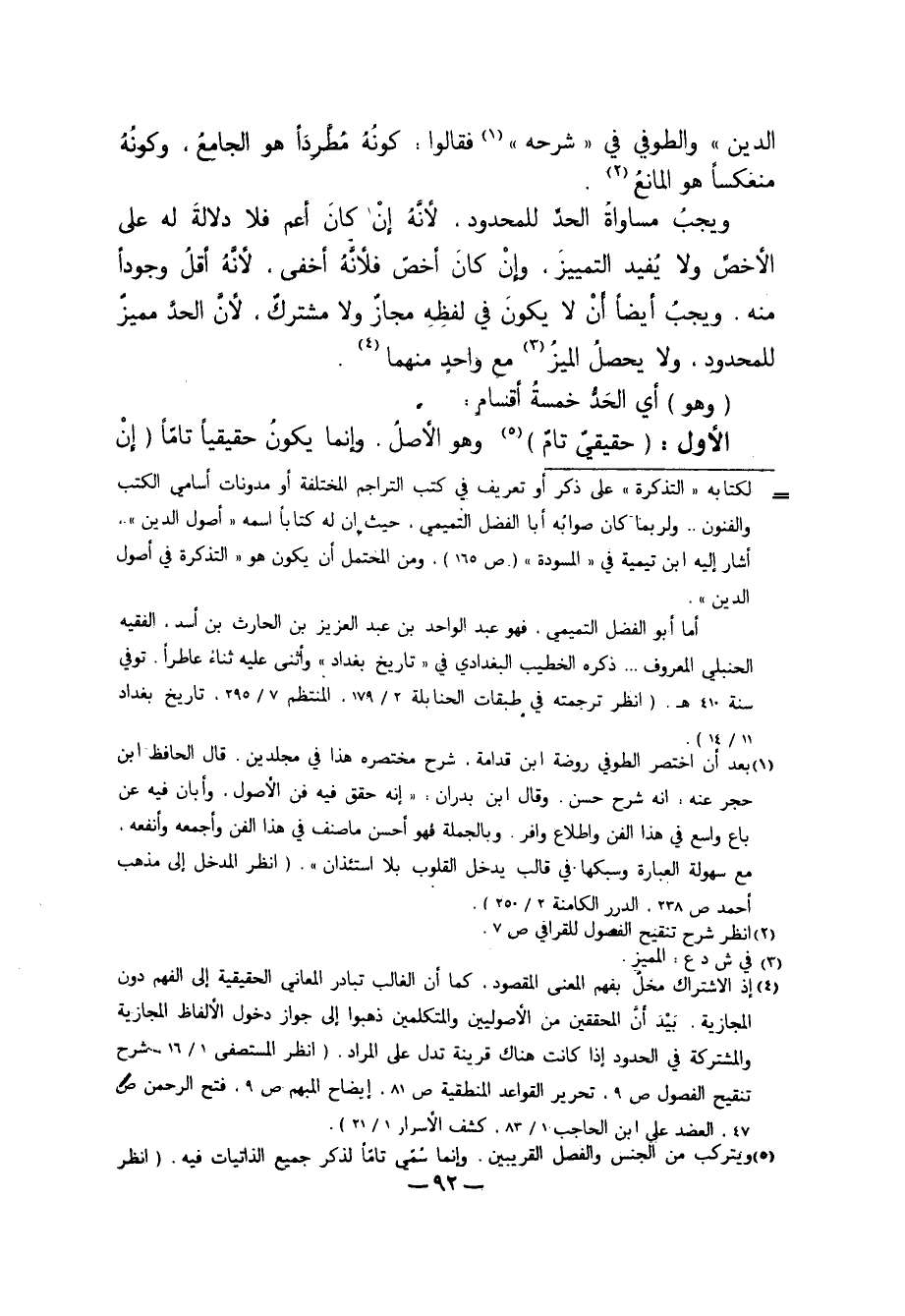 4 إذا الاشتراك مخل بفهم المعنى المقصود، كما أن الغالب تبادر المعاني الحقيقية إلى الفهم دون المجازية، بَيْدَ أنَّ المحققين من الأصوليين والمتكلمين ذهبوا إلى جواز دخول الألفاظ المجازية والمشتركة في الحدود إذا كانت هناك قرينة تدل على المراد. "انظر المستصفى 1/ 16، شرح تنقيح الفصول ص9، تحرير القواعد المنطقية ص81، إيضاح المبهم ص9، فتح الرحمن ص47، العضد على ابن الحاجب 1/ 38، كشف الأسرار 1/ 21".