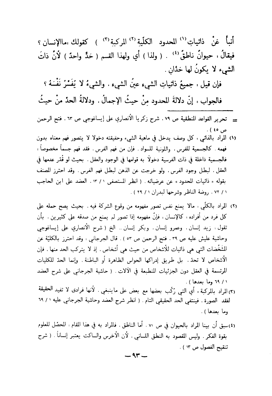 2 المراد بالكلّي: مالا يمنع نفس تصور مفهومه من وقوع الشركة فيه، بحيث يصح حمله على كل فرد من أفراده: كالإنسان: فإنَّ مفهومه إذا تصور لم يمنع من صدقه على كثيرين، بأن تقول: زيد إنسان، وعمرو إنسان، وبكر إنسان.. الخ "شرح الأنصاري على إيساغوجي وحاشية عليش عليه ص39، فتح الرحمن ص53". قال الجراجاني: وقد احترز بالكليّة عن المشَخَّصات التي هي ذاتيات للأشخاص من حيث هي أشخاص، إذ لا يتركب الحد منها، فإن الأشخاص لا تحدّ، بل طريق إدراكها الحواس الظاهرة أو الباطنة، وإنما الحدّ للكليات المرتسمة في العقل دون الجزئيات المنطبعة في الآلات. "حاشية الجرجاني على شرح العضد 1/ 69 وما بعدها".