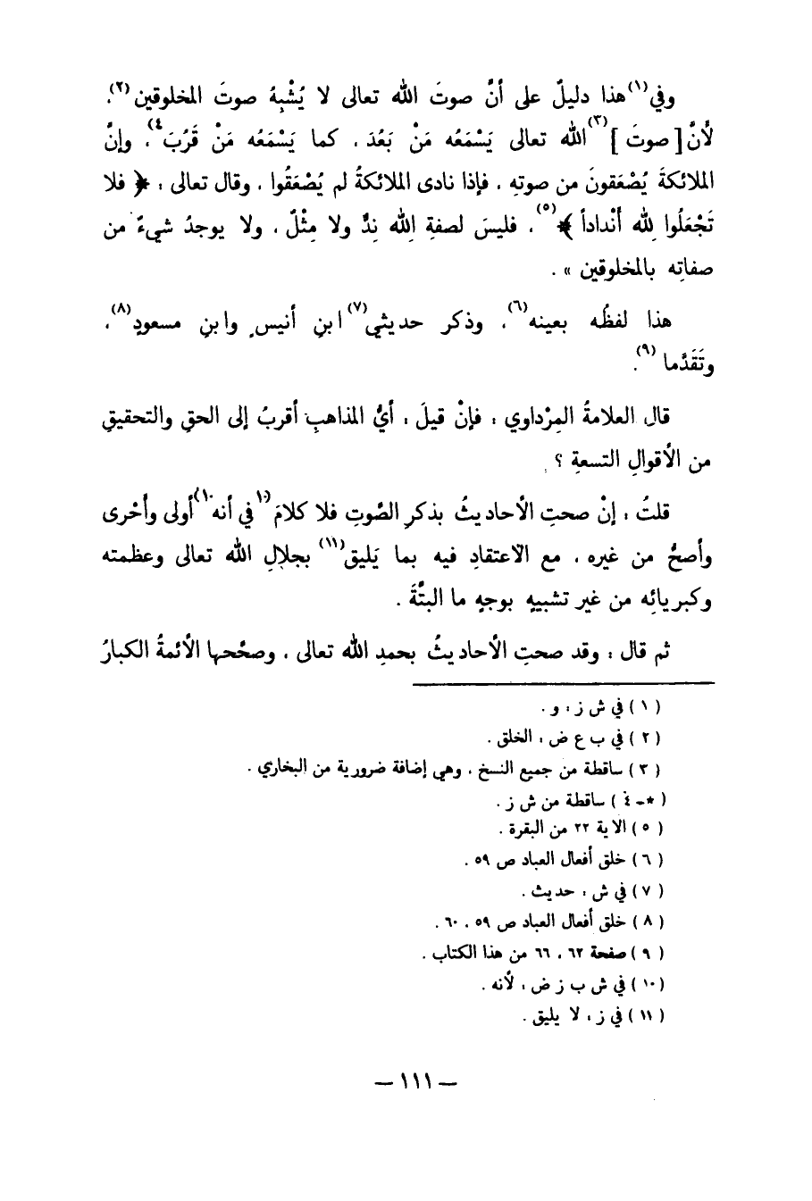 هَذَا لَفْظُهُ بِعَيْنِهِ6. وَذَكَرَ حَدِيثَيْ7 ابْنِ أُنَيْسٍ وَابْنِ مَسْعُودٍ8، وَتَقَدَّمَا9. قَالَ الْعَلاَّمَةُ الْمِرْدَاوِيُّ. فَإِنْ قِيلَ: أَيُّ الْمَذَاهِبِ أَقْرَبُ إلَى الْحَقِّ وَالتَّحْقِيقِ مِنْ الأَقْوَالِ التِّسْعَةِ؟ قُلْت: إنْ صَحَّتِ الأَحَادِيثُ بِذِكْرِ الصَّوْتِ فَلا كَلامَ "10فِيْ أَنَّهُ10" أَوْلَى وَأَحْرَى وَأَصَحُّ مِنْ غَيْرِهِ، مَعَ الاعْتِقَادِ فِيهِ بِمَا يَلِيقُ11 بِجَلالِ اللَّهِ تَعَالَى وَعَظَمَتِهِ وَكِبْرِيَائِهِ مِنْ غَيْرِ تَشْبِيهٍ بِوَجْهٍ مَا أَلْبَتَّةَ. ثُمَّ قَالَ: وَقَدْ صَحَّتْ الأَحَادِيثُ بِحَمْدِ اللَّهِ تَعَالَى، وَصَحَّحَهَا الأَئِمَّةُ الْكِبَارُ