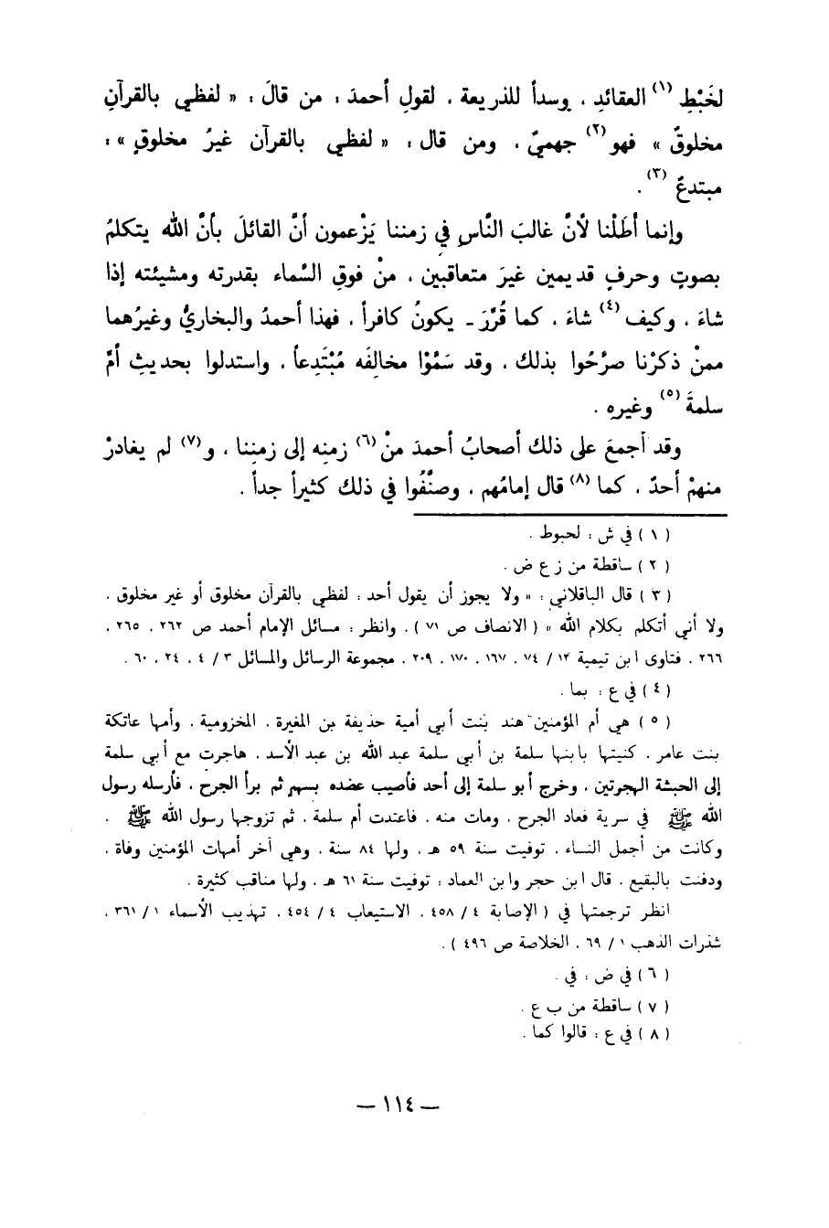 وَإِنَّمَا أَطَلْنَا لأَنَّ غَالِبَ النَّاسِ فِي زَمَنِنَا يَزْعُمُونَ أَنَّ الْقَائِلَ بِأَنَّ اللَّهَ يَتَكَلَّمُ بِصَوْتٍ وَحَرْفٍ قَدِيمَيْنِ غَيْرِ مُتَعَاقِبَيْنِ مِنْ فَوْقِ السَّمَاءِ بِقُدْرَتِهِ وَمَشِيئَتِهِ إذَا شَاءَ وَكَيْفَ4 شَاءَ، كَمَا قُرِّرَ، يَكُونُ كَافِرًا. فَهَذَا أَحْمَدُ وَالْبُخَارِيُّ وَغَيْرُهُمَا مِمَّنْ ذَكَرْنَا صَرَّحُوا بِذَلِكَ. وَقَدْ سَمَّوْا مُخَالِفَهُ مُبْتَدِعًا. وَاسْتَدَلُّوا بِحَدِيثِ أُمِّ سَلَمَةَ5 وَغَيْرِهِ.