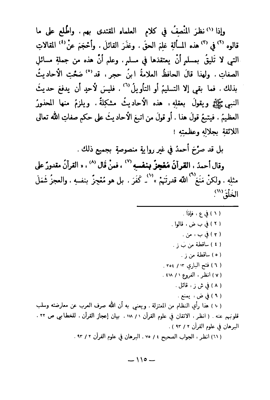 وَإِذَا1 نَظَرَ الْمُنْصِفُ فِي كَلامِ الْعُلَمَاءِ الْمُقْتَدَى بِهِمْ. وَاطَّلَعَ عَلَى مَا قَالُوهُ2 فِي3 هَذِهِ الْمَسْأَلَةِ عَلِمَ الْحَقَّ وَعَذَرَ الْقَائِلَ، وَأَحْجَمَ عَنِ4 الْمَقَالاتِ الَّتِي لا تَلِيقُ بِمُسْلِمٍ أَنْ يَعْتَقِدَهَا فِي مُسْلِمٍ، وَعَلِمَ أَنَّ هَذِهِ مِنْ جُمْلَةِ مَسَائِلِ الصِّفَاتِ. وَلِهَذَا قَالَ الْحَافِظُ الْعَلاَّمَةُ ابْنُ حَجَرٍ: قَدْ5 صَحَّتْ الأَحَادِيثُ بِذَلِكَ. فَمَا بَقِيَ إلاَّ التَّسْلِيمُ أَوْ التَّأْوِيلُ6، فَلَيْسَ لأَحَدٍ أَنْ يَدْفَعَ حَدِيثَ النَّبِيِّ صلى الله عليه وسلم وَيَقُولَ: بِعَقْلِهِ هَذِهِ الأَحَادِيثُ مُشْكِلَةٌ، وَيَلْزَمُ مِنْهَا الْمَحْذُورُ الْعَظِيمُ. فَيَتْبَعُ قَوْلَ هَذَا، أَوْ قَوْلَ مَنْ اتَّبَعَ الأَحَادِيثَ عَلَى حُكْمِ صِفَاتِ اللَّهِ تَعَالَى اللاَّئِقَةِ بِجَلالِهِ وَعَظَمَتِهِ! بَلْ قَدْ صَرَّحَ أَحْمَدُ فِي غَيْرِ رِوَايَةٍ مَنْصُوصَةٍ بِجَمِيعِ ذَلِكَ.