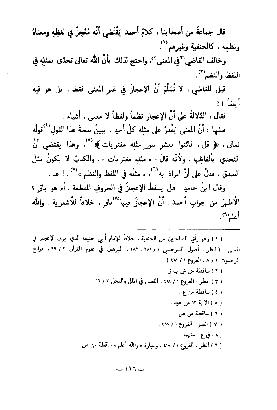 قَالَ جَمَاعَةٌ مِنْ أَصْحَابِنَا: كَلامُ أَحْمَدَ يَقْتَضِي أَنَّهُ مُعْجِزٌ فِي لَفْظِهِ وَمَعْنَاهُ وَنَظْمِهِ. كَالْحَنَفِيَّةِ وَغَيْرِهِمْ1.