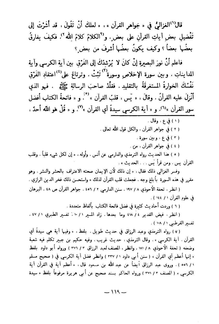 قَالَ1 الْغَزَالِيُّ فِي "جَوَاهِرِ الْقُرْآنِ": "لَعَلَّك أَنْ تَقُولَ: قَدْ أَشَرْت إلَى تَفْضِيلِ بَعْضِ آيَاتِ الْقُرْآنِ عَلَى بَعْضٍ، و2الْكَلامُ كَلامُ اللَّهِ3. فَكَيْفَ يُفَارِقُ بَعْضُهَا بَعْضًا؟ وَكَيْفَ يَكُونُ بَعْضُهَا أَشْرَفَ مِنْ بَعْضٍ؟