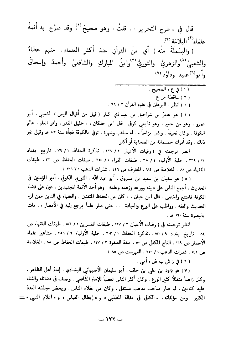 4 هو عامر بن شراحيل بن عبد ذي كبار "قيل من أقيال اليمن" الشعبي، أبو عمرو. وهو من حمير، وهو تابعي كوفي. قال ابن خلكان: جليل القدر، وافر العلم، عالم الكوفة، وكان نحيفاً، وكان مزاحاً. له مناقب وشهرة، توفي بالكوفة فجأة سنة 103هـ، وقيل غير ذلك، وقد أدرك خمسمائة من الصحابة أو أكثر.