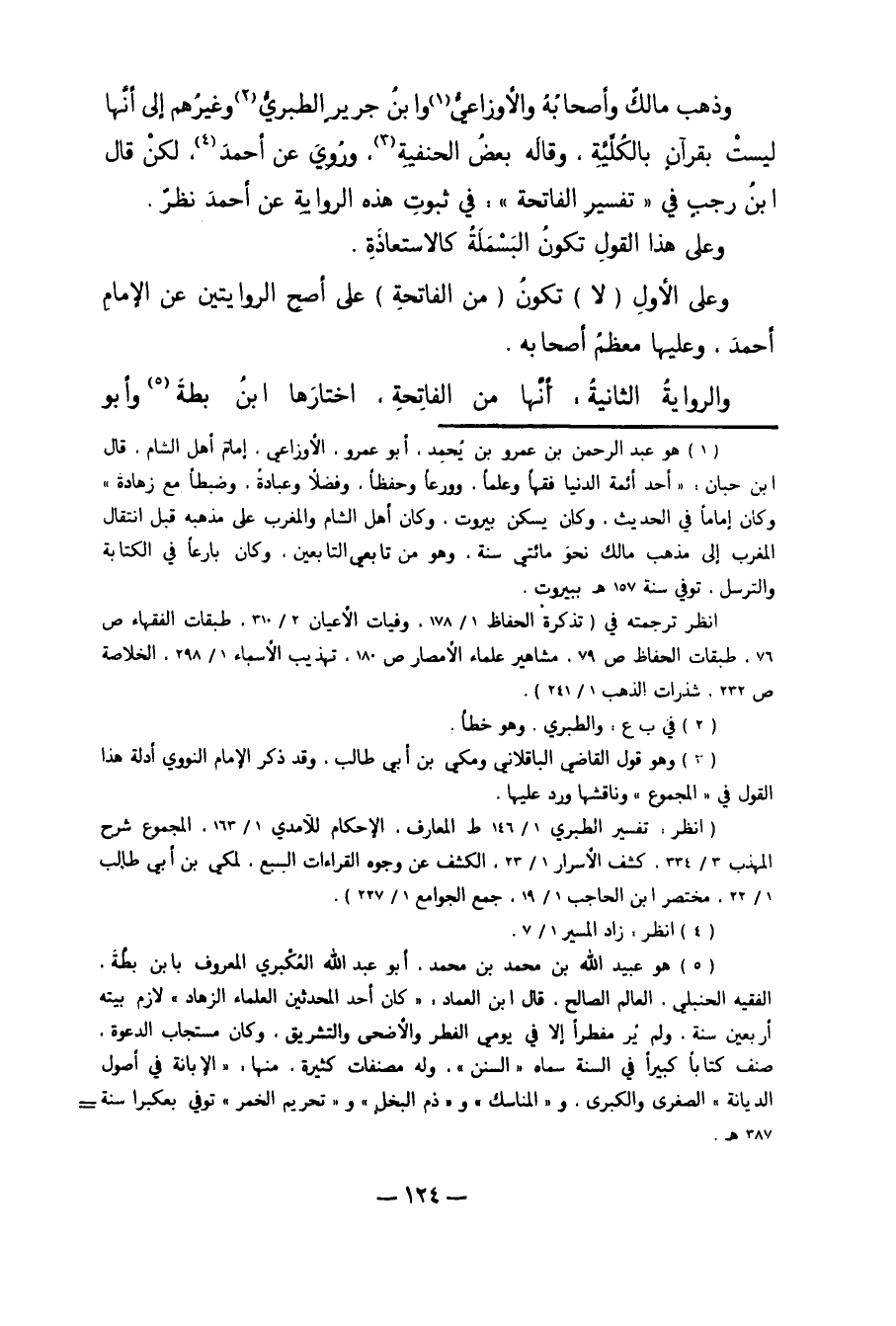 وَذَهَبَ مَالِكٌ وَأَصْحَابُهُ وَالأَوْزَاعِيُّ1 وَابْنُ جَرِيرٍ الطَّبَرِيُّ2 وَغَيْرُهُمْ إلَى أَنَّهَا لَيْسَتْ بِقُرْآنٍ بِالْكُلِّيَّةِ، وَقَالَهُ بَعْضُ الْحَنَفِيَّةِ3. وَرُوِيَ عَنْ أَحْمَدَ4، لَكِنْ قَالَ ابْنُ رَجَبٍ فِي "تَفْسِيرِ الْفَاتِحَةِ": فِي ثُبُوتِ هَذِهِ الرِّوَايَةِ عَنْ أَحْمَدَ نَظَرٌ. وَعَلَى هَذَا الْقَوْلِ: تَكُونُ الْبَسْمَلَةُ كَالاسْتِعَاذَةِ. وَعَلَى الأَوَّلِ "لا" تَكُونُ "مِنْ الْفَاتِحَةِ" عَلَى أَصَحِّ الرِّوَايَتَيْنِ عَنْ الإِمَامِ أَحْمَدَ، وَعَلَيْهَا مُعْظَمُ أَصْحَابِهِ. وَالرِّوَايَةُ الثَّانِيَةُ: أَنَّهَا مِنْ الْفَاتِحَةِ، اخْتَارَهَا ابْنُ بَطَّةَ5 وَأَبُو