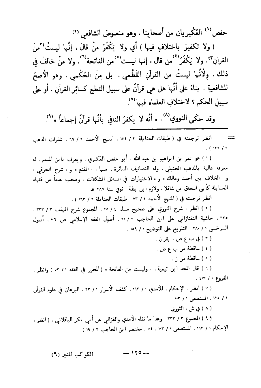 "وَلا تَكْفِيرَ بِاخْتِلافٍ فِيهَا" أَيْ وَلا يَكْفُرُ مَنْ قَالَ إنَّهَا لَيْسَتْ 3مِنْ الْقُرْآنِ5، وَلا يَكْفُرُ4 مَنْ قَالَ إنَّهَا لَيْسَتْ5 مِنْ الْفَاتِحَةِ6، وَلا مَنْ خَالَفَ فِي ذَلِكَ. وَلأَنَّهَا لَيْسَتْ مِنْ الْقُرْآنِ الْقَطْعِيِّ، بَلْ مِنْ الْحُكْمِيِّ، وَهُوَ الأَصَحُّ لِلشَّافِعِيَّةِ، بِنَاءً عَلَى أَنَّهَا هَلْ هِيَ قُرْآنٌ عَلَى سَبِيلِ الْقَطْعِ، كَسَائِرِ الْقُرْآنِ، أَوْ عَلَى سَبِيلِ الْحُكْمِ، لاخْتِلافِ الْعُلَمَاءِ فِيهَا7.