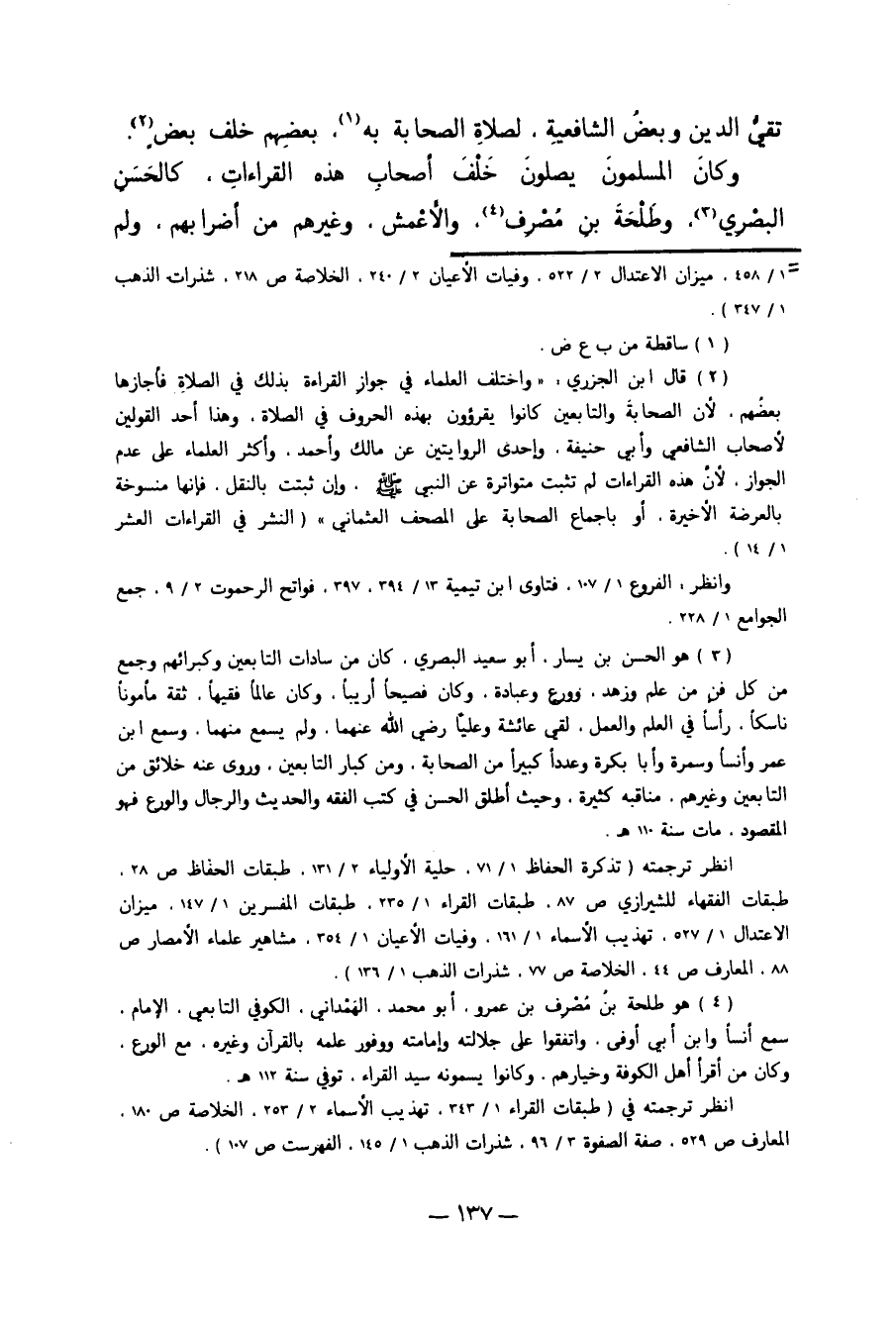 4 هو طلحة بن مُصرف بن عمرو، أبو محمد الهَمْداني، الكوفي التابعي، الإمام، سمع أنساً وابن أبي أوفى. واتفقوا على جلالته وإمامته ووفور علمه بالقرآن وغيره، مع الورع، وكان من أقرأ أهل الكوفة وخيارهم، وكانوا يسمونه سيد القراء. توفي سنة 112هـ.