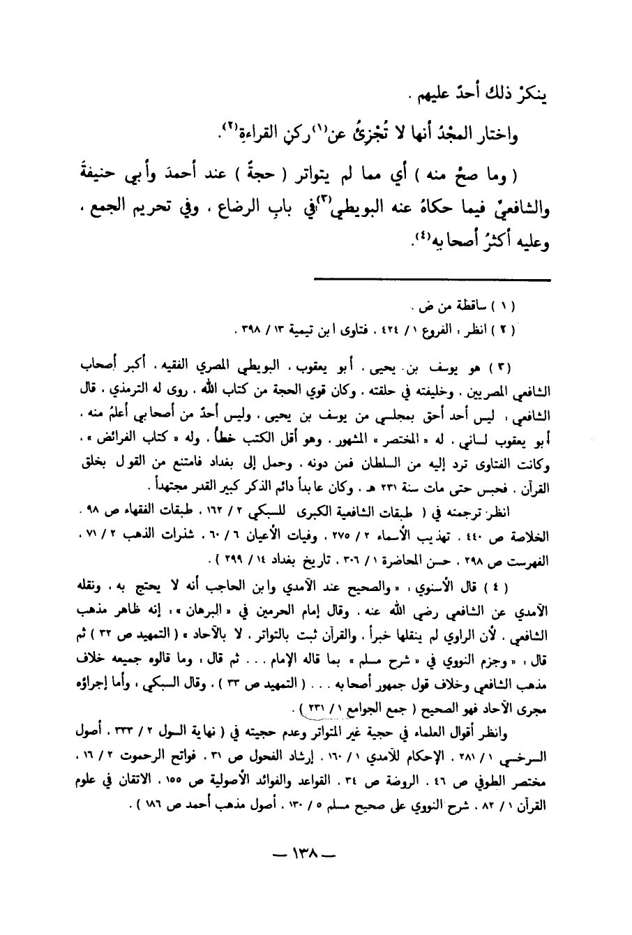 4 قال الأسنوي: "والصحيح عند الآمدي وابن الحاجب أنه لا يحتج به، ونقله الآمدي عن الشافعي رضي الله عنه. وقال إمام الحرمين في "البرهان": إنه ظاهر مذهب الشافعي، لأن الراوي لم ينقلها خبراً، والقرآن ثبت بالتواتر، لا بالآحاد". "التمهيد ص 32". ثم قال: "وجزم النووي في "شرح مسلم" بما قاله الإمام ... ثم قال: وما قالوه جميعه خلاف مذهب الشافعي وخلاف قول جمهور أصحابه.... "التمهيد ص 33". وقال السبكي: وأما إجراؤه مجرى الآحاد فهو الصحيح. "جمع الجوامع 1/ 231".