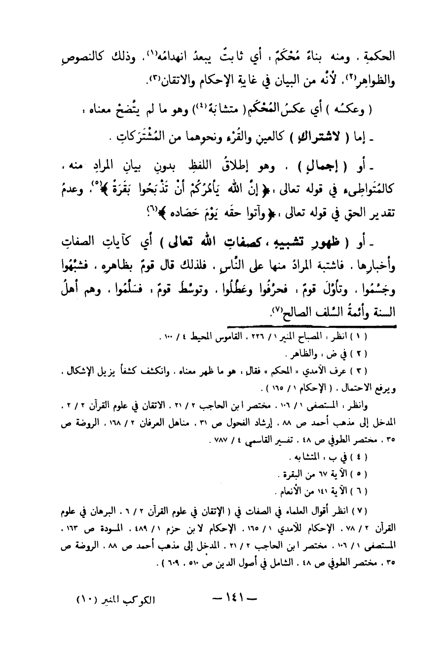 أَوْ "ظُهُورِ تَشْبِيهٍ. كَصِفَاتِ اللَّهِ تَعَالَى" أَيْ كَآيَاتِ الصِّفَاتِ وَأَخْبَارِهَا. فَاشْتَبَهَ الْمُرَادُ مِنْهَا عَلَى النَّاسِ. فَلِذَلِكَ قَالَ قَوْمٌ: بِظَاهِرِهِ فَشَبَّهُوا وَجَسَّمُوا، وَتَأَوَّلَ قَوْمٌ: فَحَرَّفُوا وَعَطَّلُوا. وَتَوَسَّطَ قَوْمٌ: فَسَلَّمُوا، وَهُمْ أَهْلُ السُّنَّةِ وَأَئِمَّةُ السَّلَفِ الصَّالِحِ7.