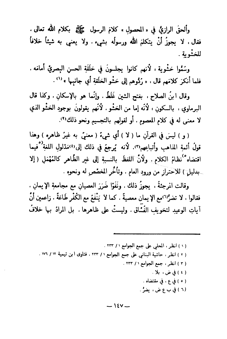 وَأَلْحَقَ الرَّازِيّ فِي الْمَحْصُولِ كَلامَ الرَّسُولِ صلى الله عليه وسلم بِكَلامِ اللَّهِ تَعَالَى. فَقَالَ: لا يَجُوزُ أَنْ يَتَكَلَّمَ اللَّهُ وَرَسُولُهُ بِشَيْءٍ وَلا يَعْنِي بِهِ شَيْئًا، خِلافًا لِلْحَشْوِيَّةِ. وَسُمُّوا حَشْوِيَّةً؛ لأَنَّهُمْ كَانُوا يَجْلِسُونَ فِي حَلْقَةِ الْحَسَنِ الْبَصْرِيِّ أَمَامَهُ. فَلَمَّا أَنْكَرَ كَلامَهُمْ قَالَ: رُدُّوهُمْ إلَى حَشْوِ الْحَلْقَةِ، أَيْ جَانِبِهَا1.