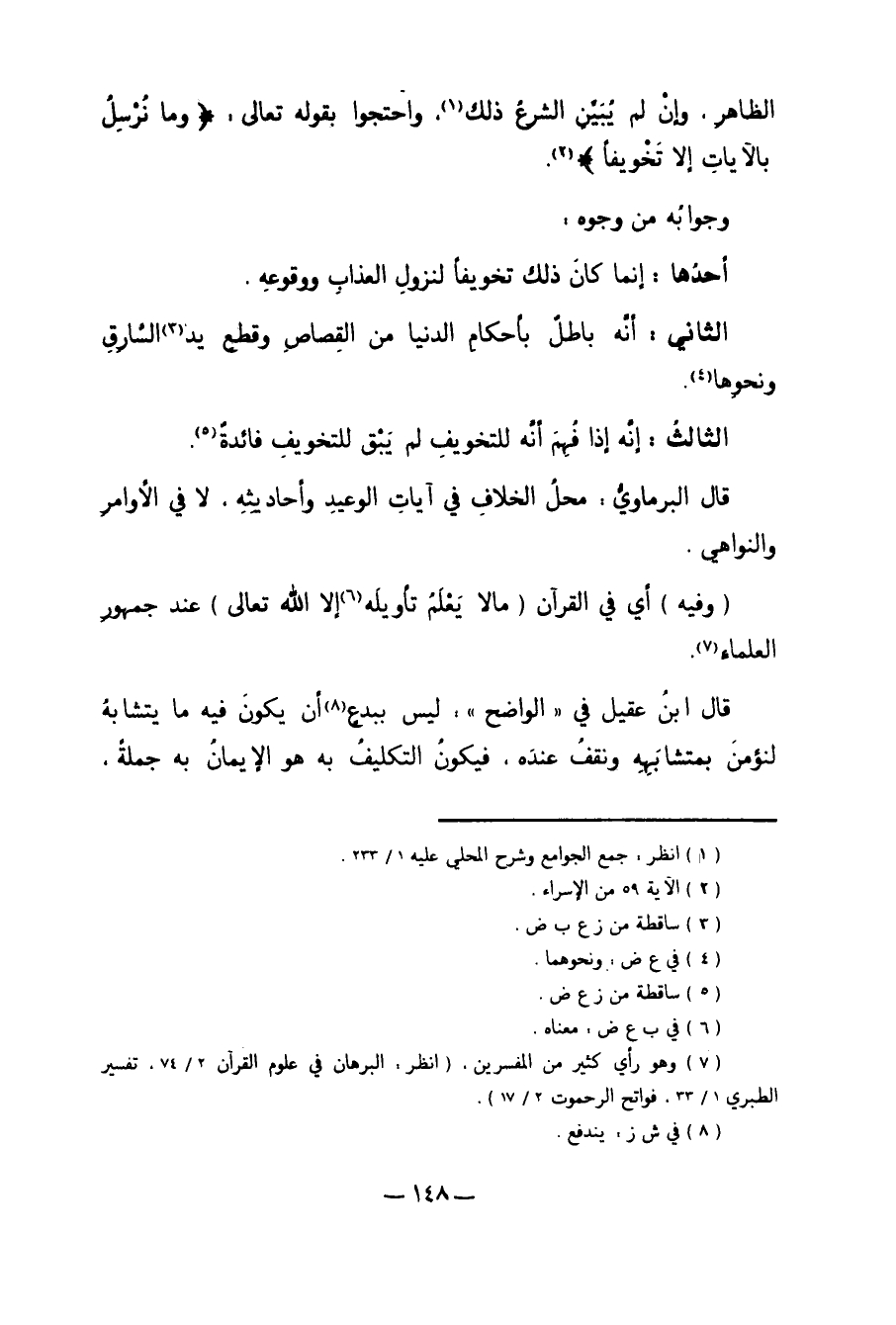 الثَّالِثُ: أَنَّهُ إذَا فُهِمَ أَنَّهُ لِلتَّخْوِيفِ، لَمْ يَبْقَ لِلتَّخْوِيفِ فَائِدَةٌ5. قَالَ الْبِرْمَاوِيُّ: مَحَلُّ الْخِلافِ فِي آيَاتِ الْوَعِيدِ وَأَحَادِيثِهِ. لا فِي الأَوَامِرِ وَالنَّوَاهِي."وَفِيهِ" أَيْ فِي الْقُرْآنِ "مَا لا يَعْلَمُ تَأْوِيلَهُ6 إلاَّ اللَّهُ تَعَالَى" عِنْدَ جُمْهُورِ الْعُلَمَاءِ7. قَالَ ابْنُ عَقِيلٍ فِي "الْوَاضِحِ": لَيْسَ بِبِدْعٍ8 أَنْ يَكُونَ فِيهِ مَا يَتَشَابَهُ لِنُؤْمِنَ بِمُتَشَابِهِهِ وَنَقِفَ عِنْدَهُ. فَيَكُونَ التَّكْلِيفُ بِهِ هُوَ الإِيمَانُ بِهِ جُمْلَةً،