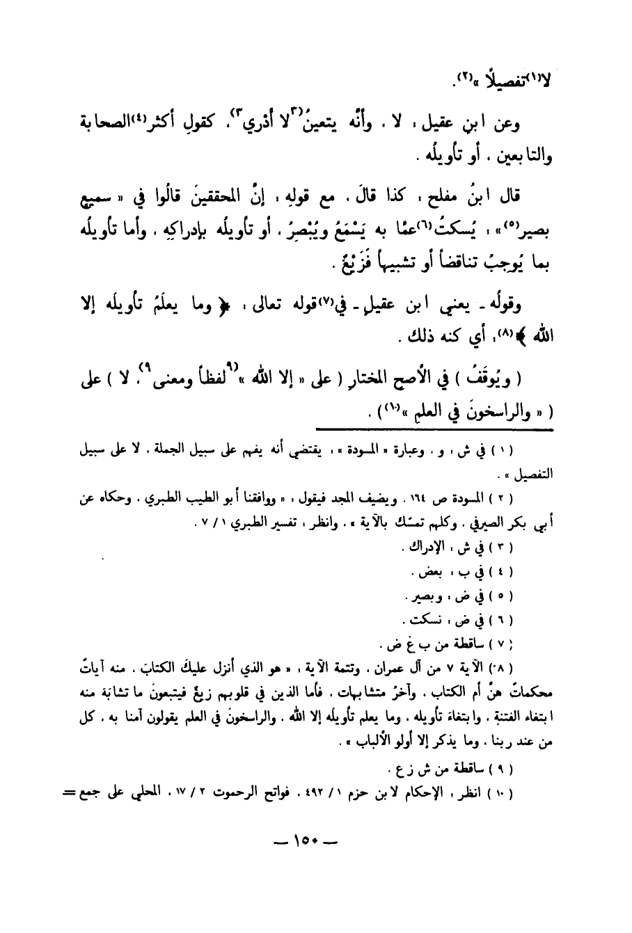 "وَيُوقَفُ" فِي الأَصَحِّ الْمُخْتَارِ "عَلَى {إلاَّ اللَّهُ} 9لَفْظًا وَمَعْنًى8 لا" عَلَى {وَالرَّاسِخُونَ فِي الْعِلْمِ} 10.