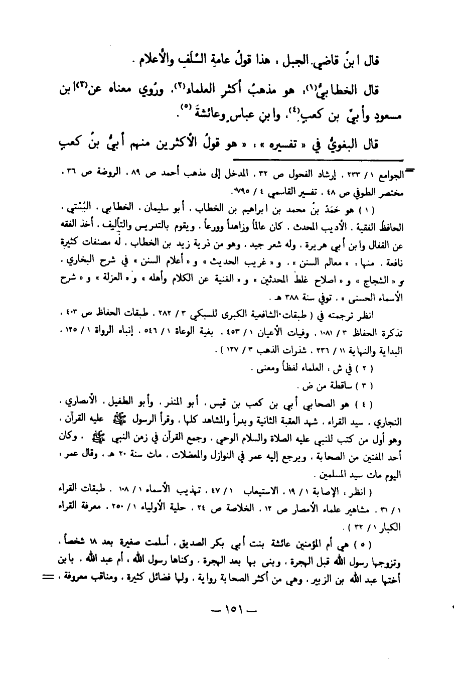 قَالَ الْخَطَّابِيُّ1: هُوَ مَذْهَبُ أَكْثَرِ الْعُلَمَاءِ2، وَرُوِيَ مَعْنَاهُ عَنِ3 ابْنِ مَسْعُودٍ وَأُبَيِّ بْنِ كَعْبٍ4 وَابْنِ عَبَّاسٍ وَعَائِشَةَ5. قَالَ الْبَغَوِيّ فِي "تَفْسِيرِهِ": "هُوَ قَوْلُ الأَكْثَرِينَ مِنْهُمْ: أُبَيّ بْنُ كَعْبٍ