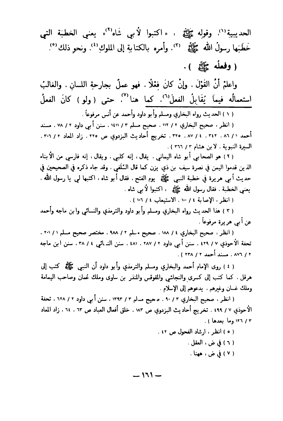 الْحُدَيْبِيَةِ1. وَقَوْلِهِ: "صلى الله عليه وسلم: "اُكْتُبُوا لأَبِي شَاهٍ" 2 يَعْنِي الْخُطْبَةَ الَّتِي خَطَبَهَا رَسُولُ اللَّهِ صلى الله عليه وسلم3، وَأَمْرِهِ بِالْكِتَابَةِ إلَى الْمُلُوكِ4 وَنَحْوِ ذَلِكَ5.