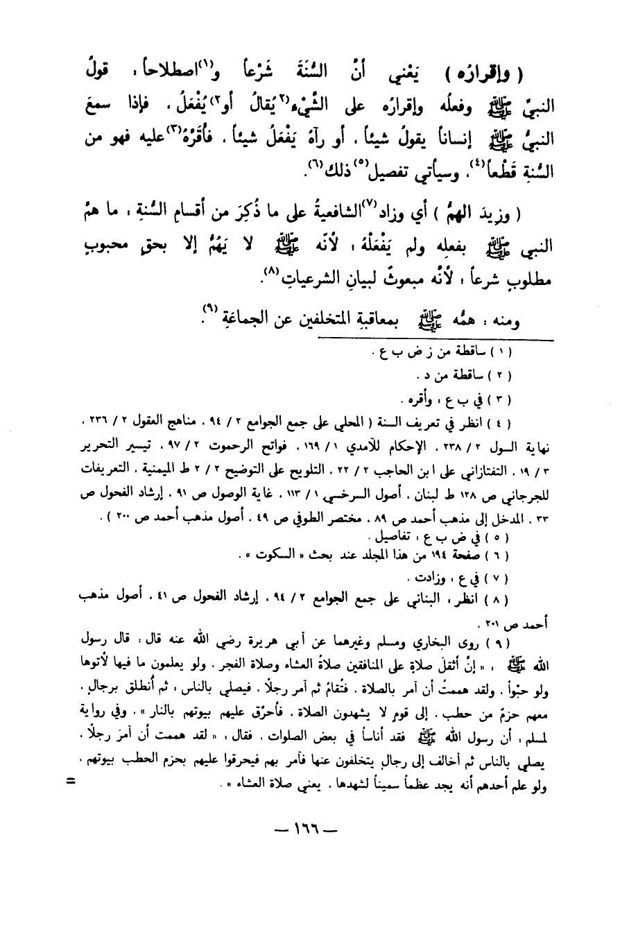 "وَإِقْرَارُهُ" يَعْنِي أَنَّ السُّنَّةَ شَرْعًا وَ1اصْطِلاحًا: قَوْلُ النَّبِيِّ صلى الله عليه وسلم وَفِعْلُهُ وَإِقْرَارُهُ عَلَى الشَّيْءِ 2يُقَالُ أَوْ7 يُفْعَلُ، فَإِذَا سَمِعَ النَّبِيُّ صلى الله عليه وسلم إنْسَانًا يَقُولُ شَيْئًا، أَوْ رَآهُ يَفْعَلُ شَيْئًا. فَأَقَرَّهُ3 عَلَيْهِ، فَهُوَ مِنْ السُّنَّةِ قَطْعًا4. وَسَيَأْتِي تَفْصِيلُ5 ذَلِكَ6. "وَزِيدَ الْهَمُّ" أَيْ وَزَادَ7 الشَّافِعِيَّةُ عَلَى مَا ذُكِرَ مِنْ أَقْسَامِ السُّنَّةِ: مَا هَمَّ النَّبِيُّ صلى الله عليه وسلم بِفِعْلِهِ وَلَمْ يَفْعَلْهُ؛ لأَنَّهُ صلى الله عليه وسلم لا يَهُمُّ إلاَّ بِحَقٍّ مَحْبُوبٍ مَطْلُوبٍ شَرْعًا؛ لأَنَّهُ مَبْعُوثٌ لِبَيَانِ الشَّرْعِيَّاتِ8. وَمِنْهُ: هَمُّهُ صلى الله عليه وسلم بِمُعَاقَبَةِ الْمُتَخَلِّفِينَ عَنْ الْجَمَاعَةِ9.