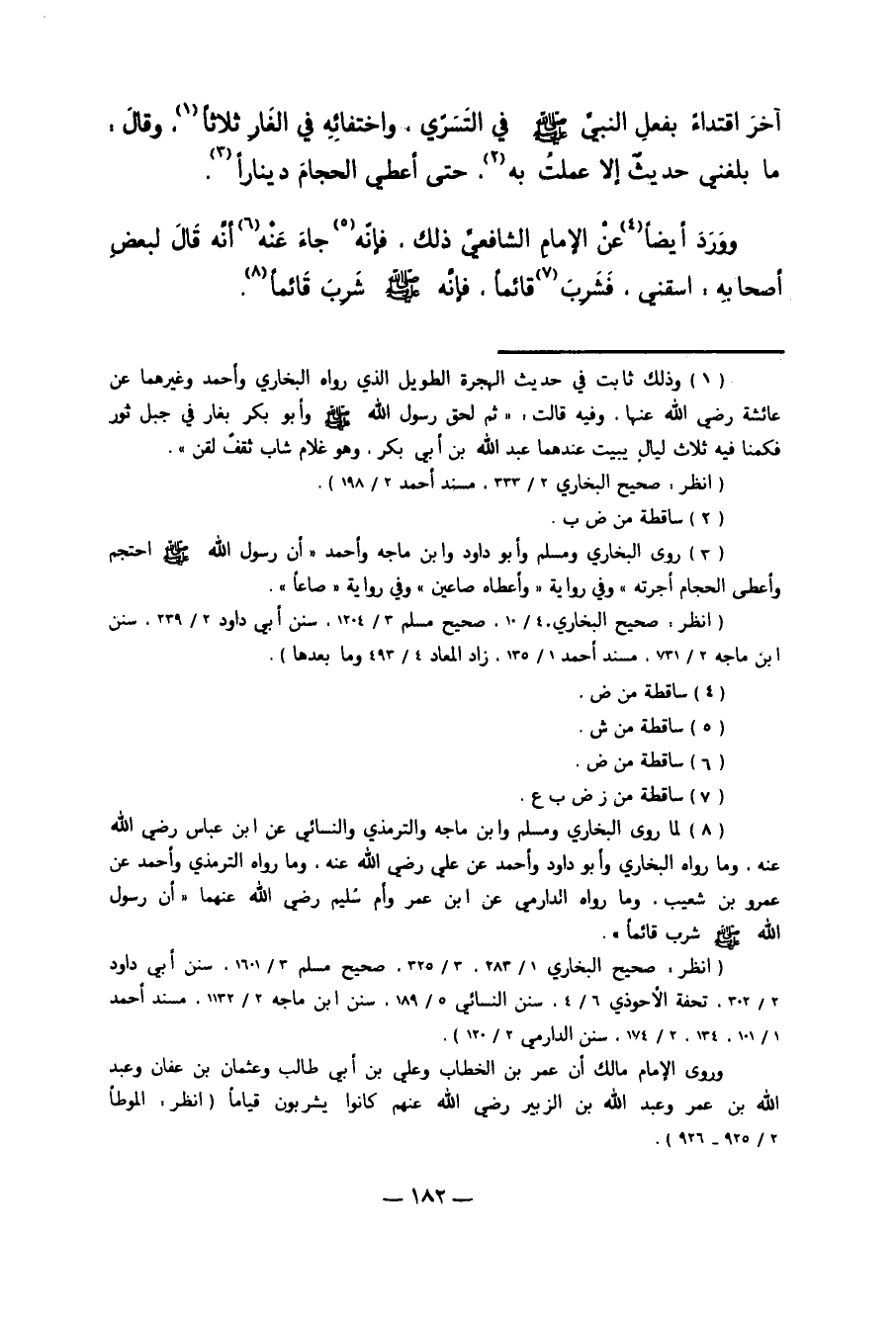 وَوَرَدَ أَيْضًا4 عَنْ الإِمَامِ الشَّافِعِيِّ فَإِنَّهُ5 جَاءَ عَنْهُ6 أَنَّهُ قَالَ لِبَعْضِ أَصْحَابِهِ: اسْقِنِي. فَشَرِبَ7 قَائِمًا. فَإِنَّهُ صلى الله عليه وسلم شَرِبَ قَائِمًا8.