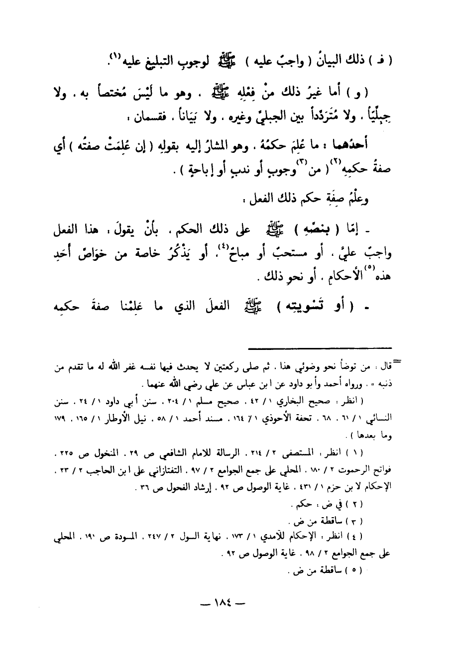 "إمَّا بِنَصِّهِ" صلى الله عليه وسلم عَلَى ذَلِكَ الْحُكْمِ، بِأَنْ يَقُولَ: هَذَا الْفِعْلُ وَاجِبٌ عَلَيَّ أَوْ مُسْتَحَبٌّ أَوْ مُبَاحٌ4، أَوْ يَذْكُرُ خَاصَّةً مِنْ خَوَاصِّ أَحَدِ هَذِهِ5 الأَحْكَامِ، أَوْ نَحْوِ ذَلِكَ.