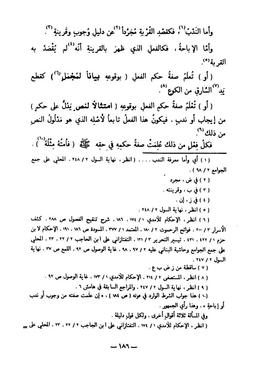 10 هذا جواب الشرط الوارد في قوله ص 184: "إن علمت صفته من وجوب أو ندب أو إباحة"، وهذا رأي الجمهور.