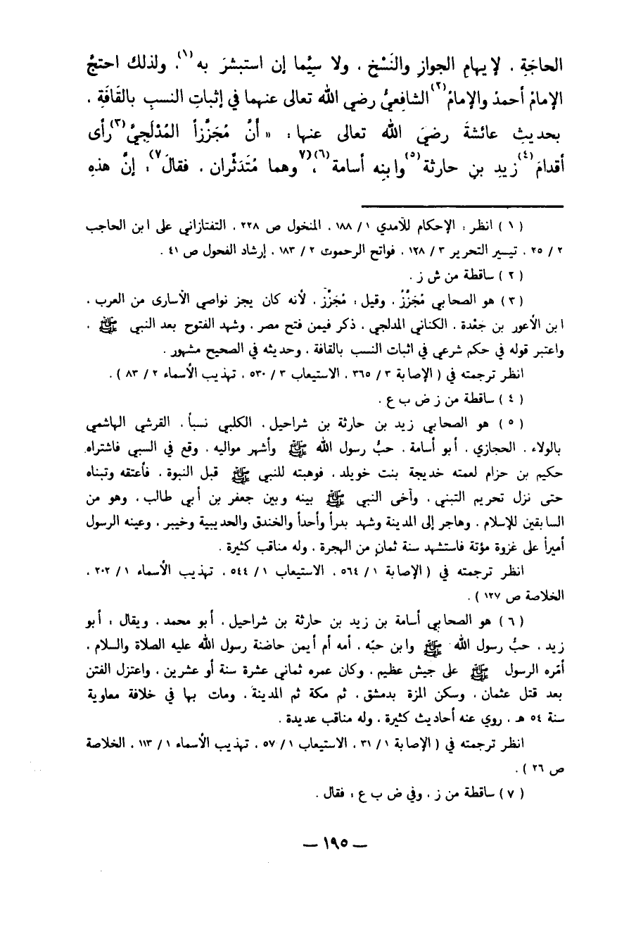 الْحَاجَةِ لإِيهَامِ الْجَوَازِ وَالنَّسْخِ، وَلا سِيَّمَا إنْ اسْتَبْشَرَ بِهِ1. وَلِذَلِكَ احْتَجَّ الإِمَامُ أَحْمَدُ وَالإِمَامُ2 الشَّافِعِيُّ رَضِيَ اللَّهُ تَعَالَى عَنْهُمَا فِي إثْبَاتِ النَّسَبِ بِالْقَافَةِ بِحَدِيثِ عَائِشَةَ رَضِيَ اللَّهُ تَعَالَى عَنْهَا "أَنَّ مُجَزِّزًا الْمُدْلِجِيَّ3، رَأَى أَقْدَامَ4 زَيْدِ بْنِ حَارِثَةَ5 وَابْنِهِ أُسَامَةَ6،7وَهُمَا مُتَدَثِّرَانِ. فَقَالَ7: إنَّ هَذِهِ