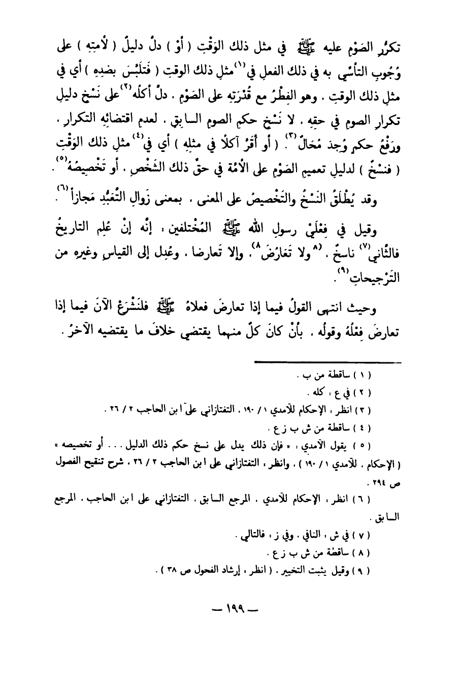 تَكَرُّرِ الصَّوْمِ عَلَيْهِ صَلَّى اللَّهُ عَلَيْهِ وَسَلَّمَ فِي مِثْلِ ذَلِكَ الْوَقْتِ "أَوْ" دَلَّ دَلِيلٌ "لأُمَّتِه"ِ عَلَى وُجُوبِ التَّأَسِّي بِهِ فِي ذَلِكَ الْفِعْلِ فِي1 مِثْلِ ذَلِكَ الْوَقْتِ "فَتَلَبَّسَ بِضِدِّهِ" أَيْ فِي مِثْلِ ذَلِكَ الْوَقْتِ، وَهُوَ الْفِطْرُ مَعَ قُدْرَتِهِ عَلَى الصَّوْمِ، دَلَّ أَكْلُهُ2 عَلَى نَسْخِ دَلِيلِ تَكْرَارِ الصَّوْمِ فِي حَقِّهِ، لا نَسْخِ حُكْمِ الصَّوْمِ السَّابِقِ، لِعَدَمِ اقْتِضَائِهِ التَّكْرَارَ. وَرَفْعُ حُكْمٍ وُجِدَ مُحَالٌ3 أَوْ "أَقَرَّ آكِلاً فِي مِثْلِهِ" أَيْ فِي4 مِثْلِ ذَلِكَ الْوَقْتِ: "فَنَسْخٌ"، لِدَلِيلِ تَعْمِيمِ الصَّوْمِ عَلَى الأُمَّةِ فِي حَقِّ ذَلِكَ الشَّخْصِ، أَوْ تَخْصِيصِهِ5.