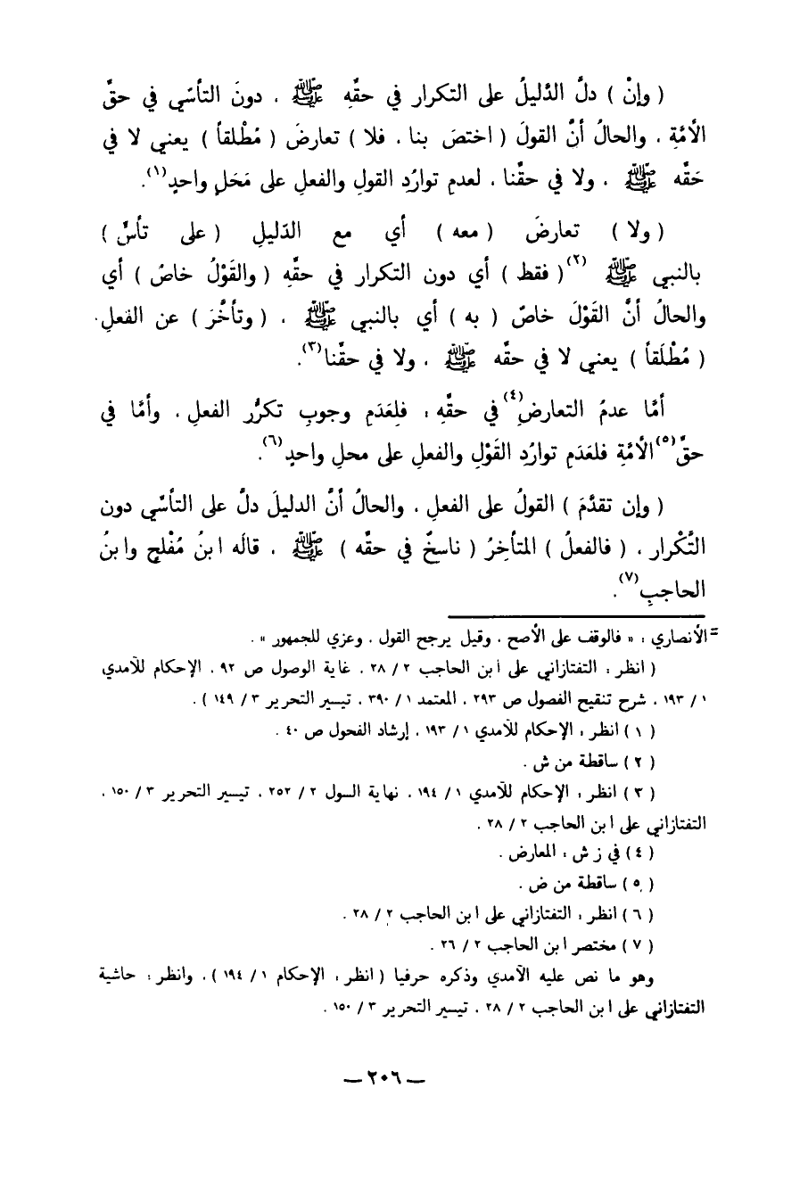 "وَلا" تَعَارُضَ "مَعَهُ" أَيْ مَعَ الدَّلِيلِ "عَلَى تَأَسٍّ" بِالنَّبِيِّ صَلَّى اللَّهُ عَلَيْهِ وَسَلَّمَ2 "فَقَطْ" أَيْ دُونَ التَّكْرَارِ فِي حَقِّهِ "وَالْقَوْلُ خَاصٌّ" أَيْ وَالْحَالُ أَنَّ الْقَوْلَ خَاصٌّ "بِه"ِ أَيْ بِالنَّبِيِّ صَلَّى اللَّهُ عَلَيْهِ وَسَلَّمَ "وَتَأَخَّرَ" عَنْ الْفِعْلِ "مُطْلَقًا" يَعْنِي لا فِي حَقِّهِ صَلَّى اللَّهُ عَلَيْهِ وَسَلَّمَ وَلا فِي حَقِّنَا3.